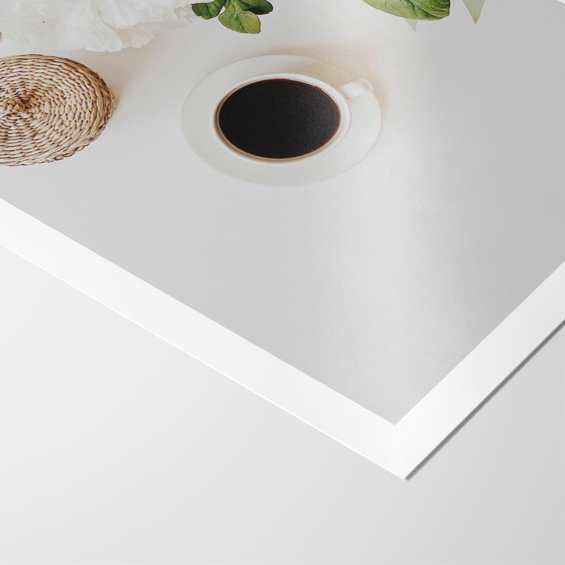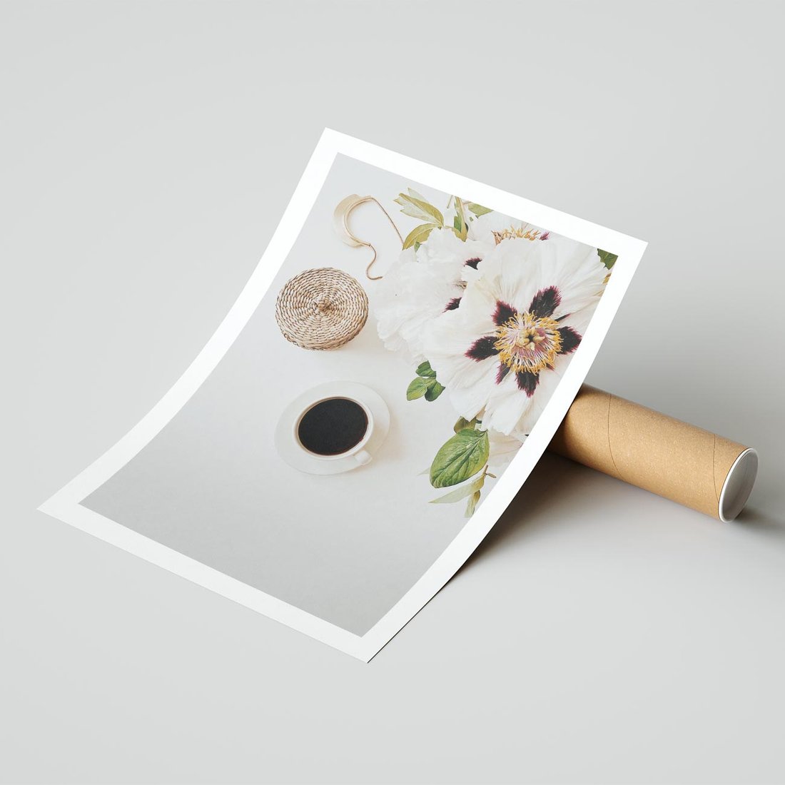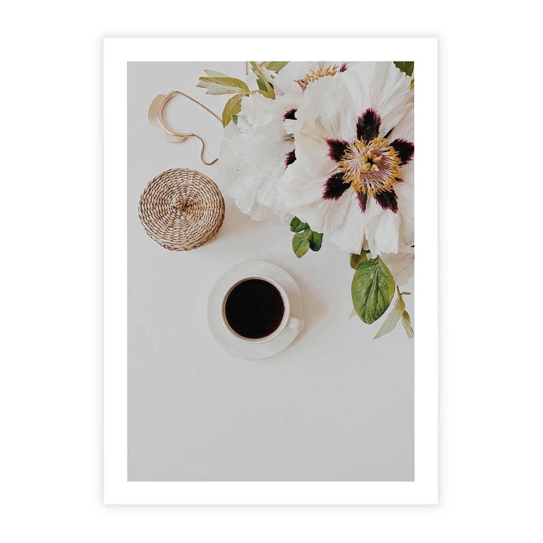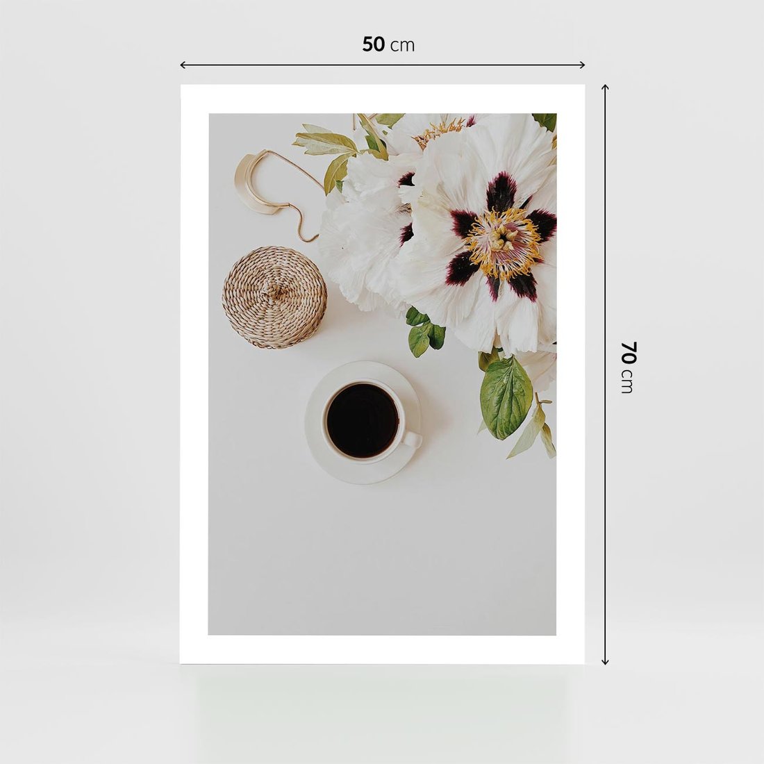 - Plakat bez ramy 50x70 - Bukiet Kwiatów i Kawa na Stole