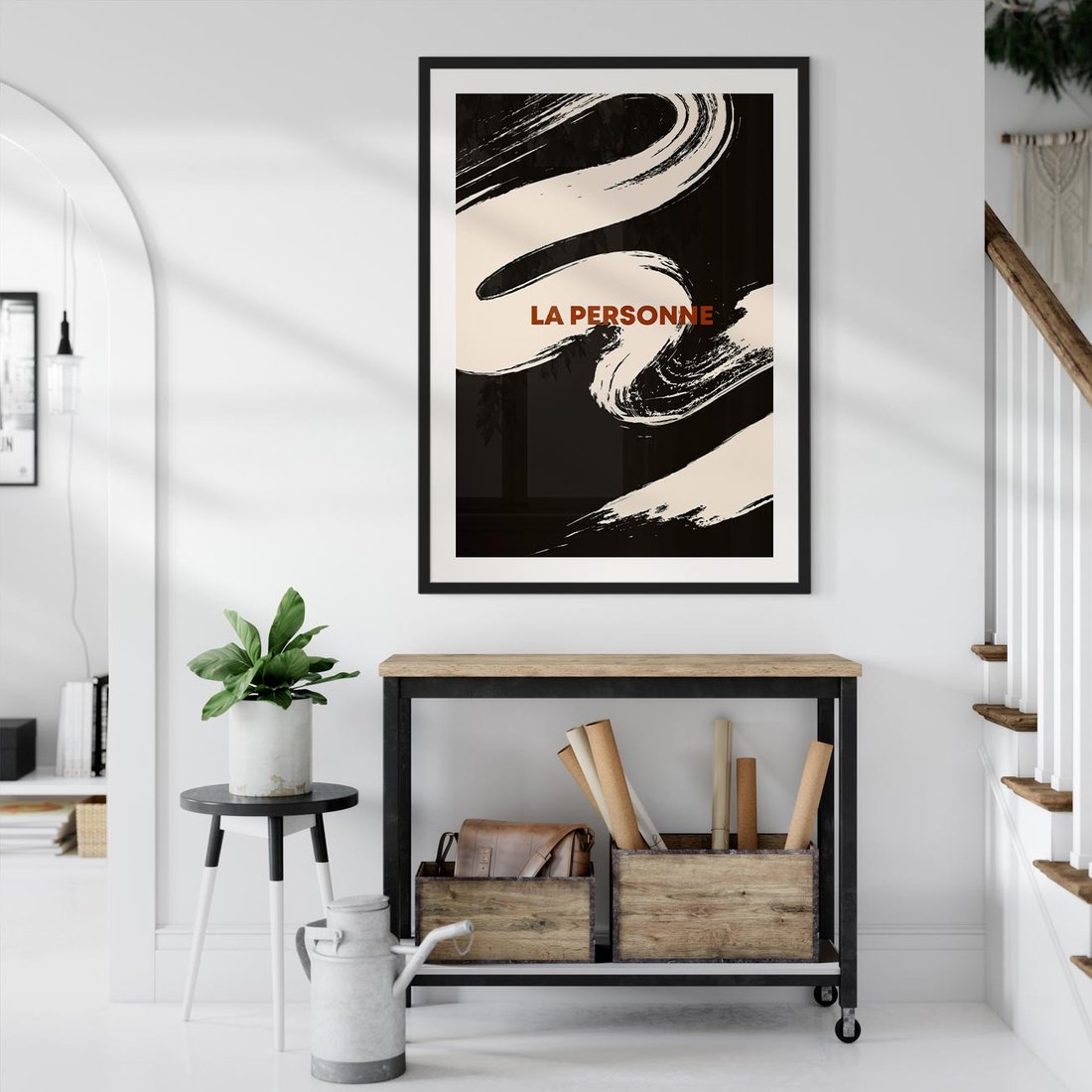To abstrakcyjne dzieło sztuki w ciemnych kolorach, w którym dominuje kolor czarny. Obraz ten eksperymentuje z formami i kontrastami, tworząc tajemniczy nastrój.