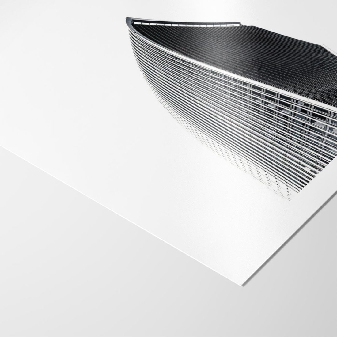 To czarno-białe ujęcie nowoczesnego wieżowca, które podkreśla jego architektoniczną strukturę i elegancję. Obraz ten emanuje surowością i nowoczesnością.