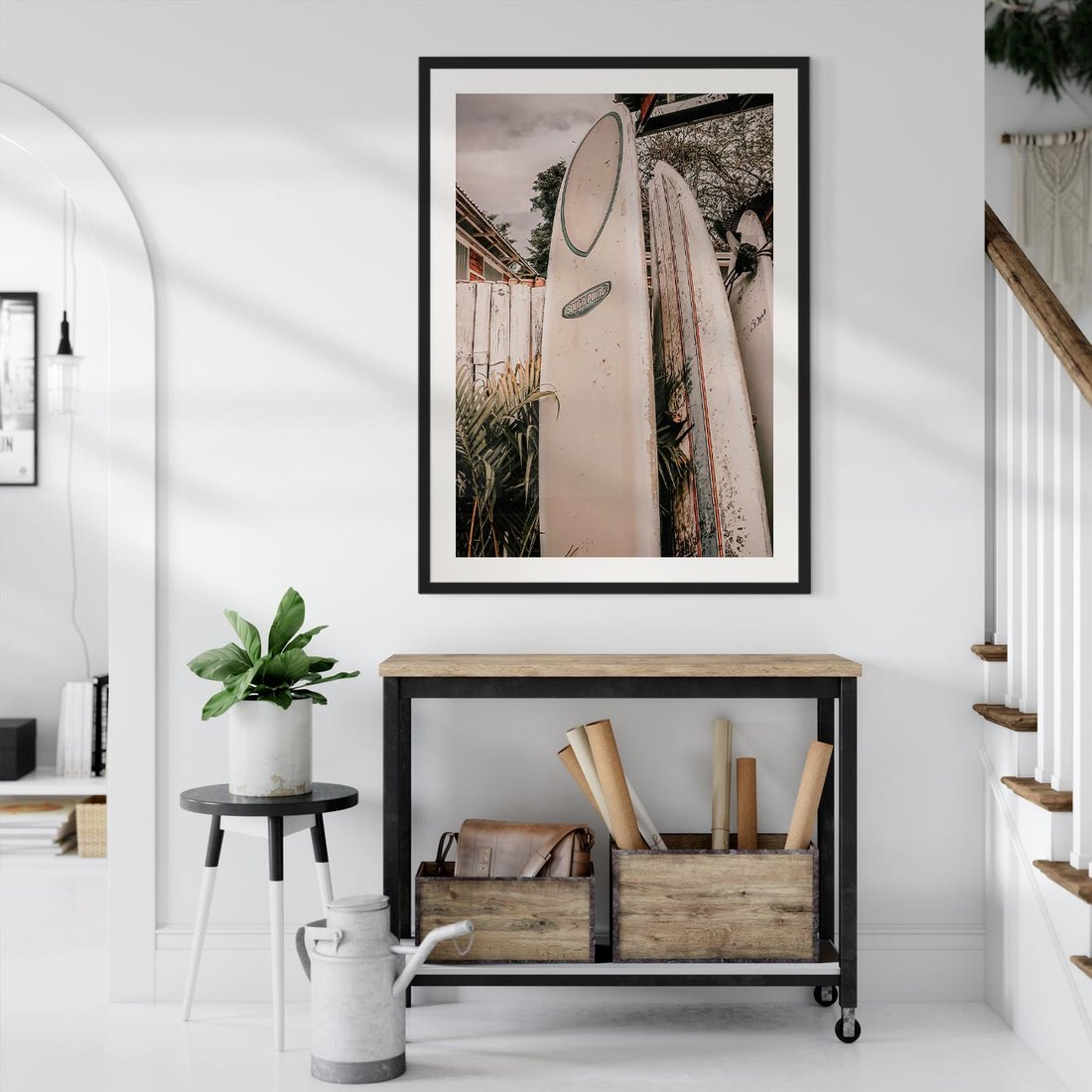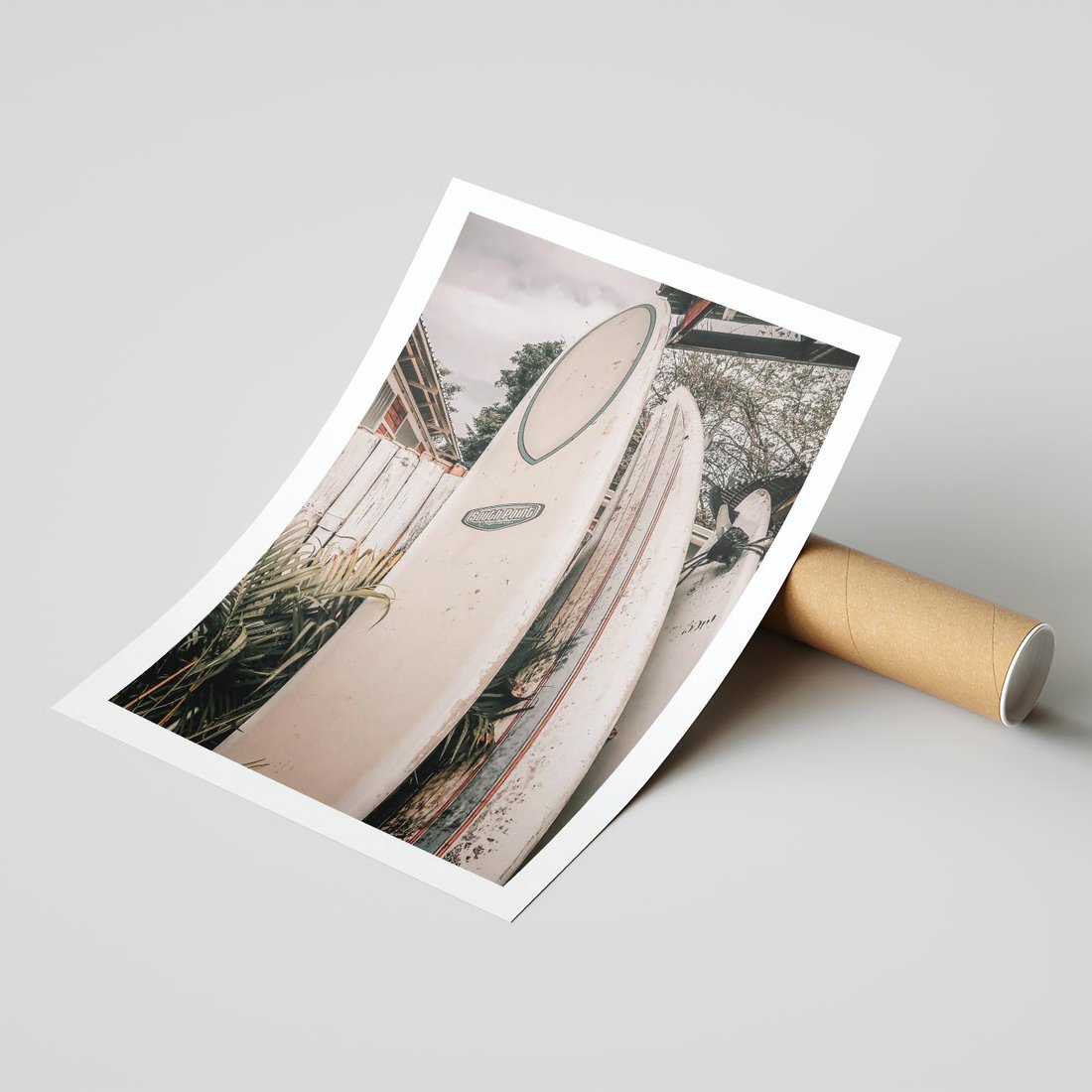 Plakat bez ramy 50x70 - Deski Surfingowe czekają na Fale - deski surfingowe, stoją pod płotem