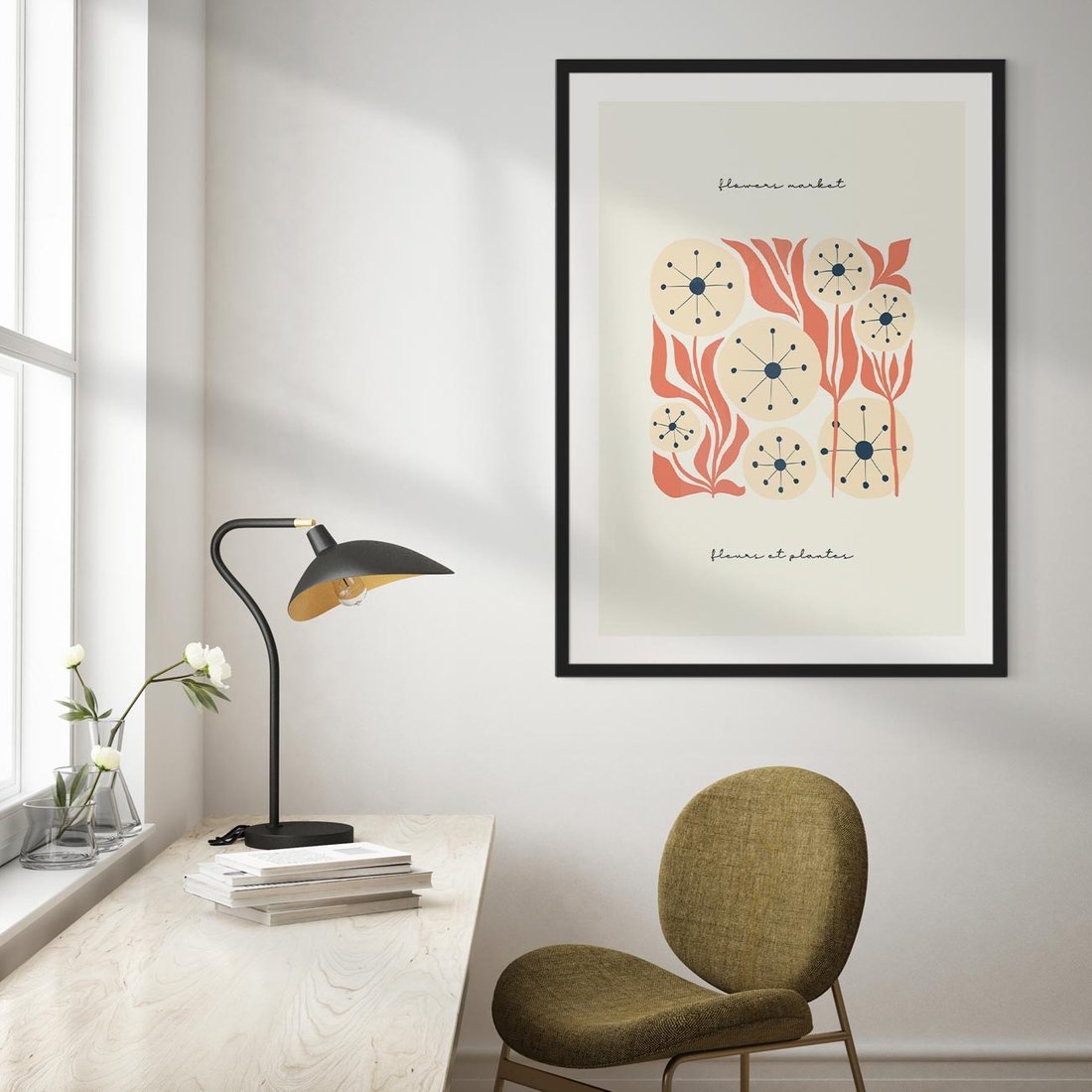Ten nowoczesny plakat ukazuje dmuchawce w abstrakcyjnym stylu, zachwycając swoją minimalistyczną estetyką. Kompozycja przenosi nas w lekki i refleksyjny świat natury, tworząc wyjątkową wizję.