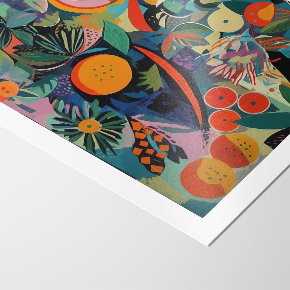 Ten abstrakcyjny obraz olejny, nawiązujący do stylu Picassa, eksploruje bogactwo kolorów i form owoców. Żywe barwy oraz swobodne linie tworzą dynamiczną kompozycję, oddającą radość i energię natury.