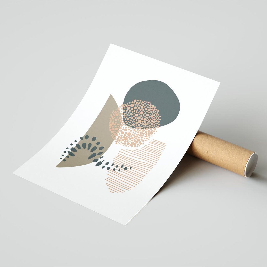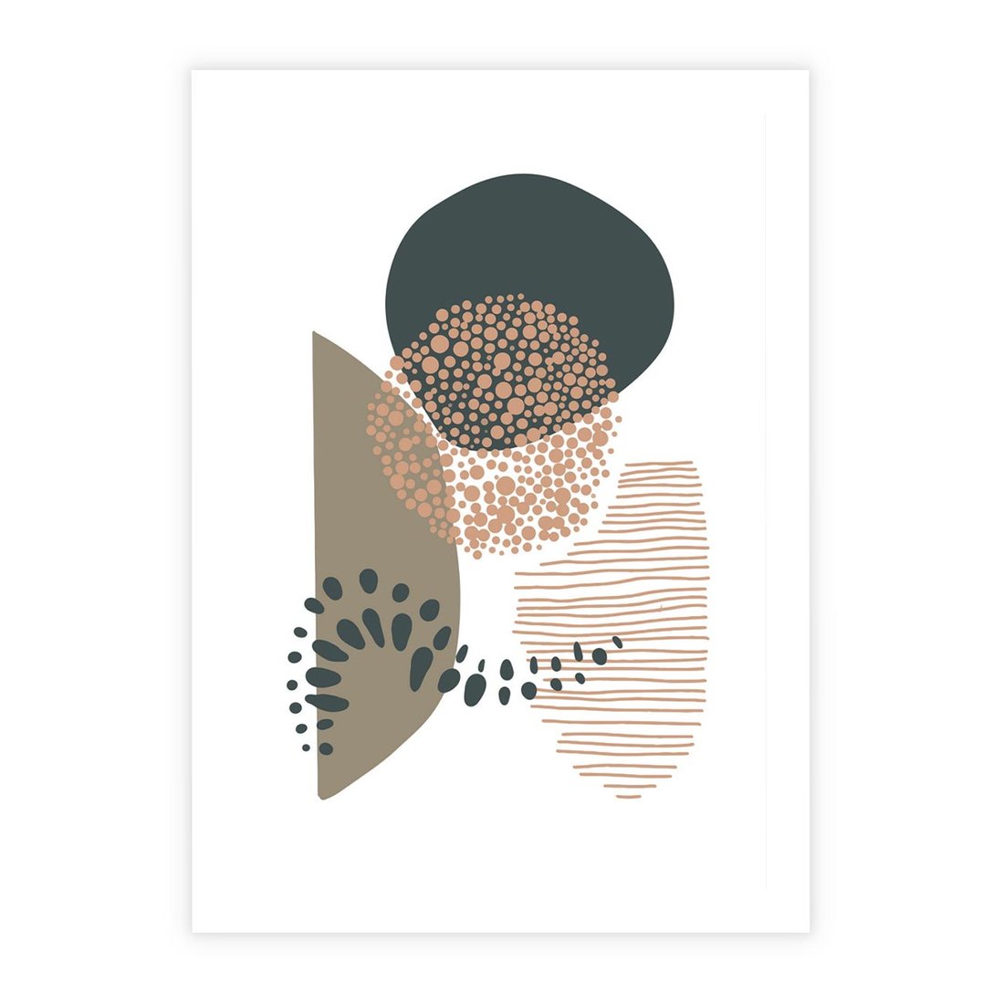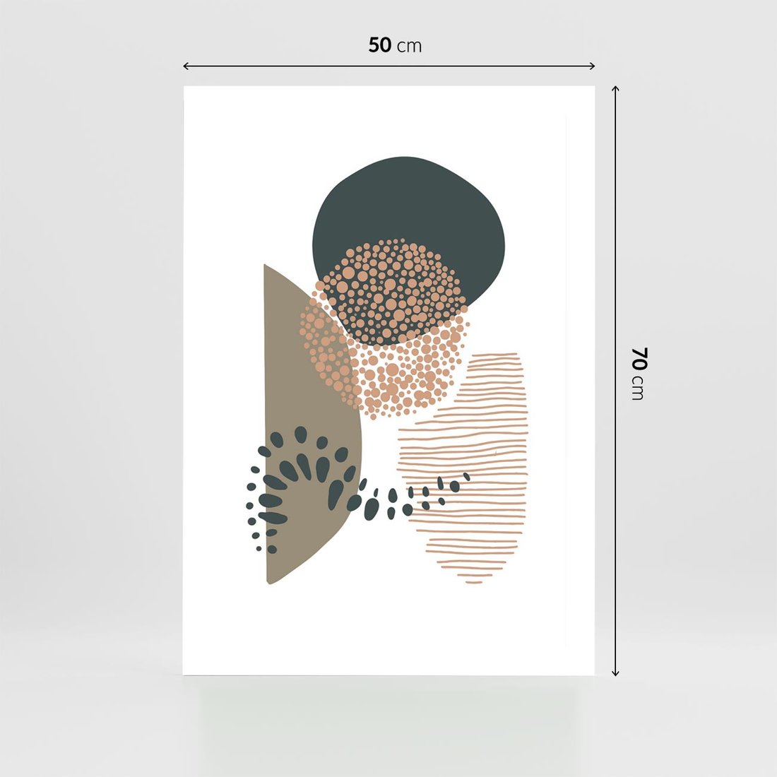 Ta abstrakcyjna kompozycja składa się z delikatnych kropek, kresek i kółek, w stonowanych odcieniach brązu i beżu. Przenosi spokój i harmonię, emanując minimalistycznym pięknem do każdego wnętrza.