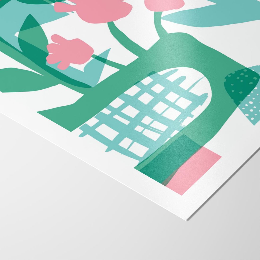 Nowoczesna sztuka w postaci abstrakcyjnych, pastelowych kwiatów o delikatnych odcieniach zieleni i różu, tworzących unikalną kompozycję.