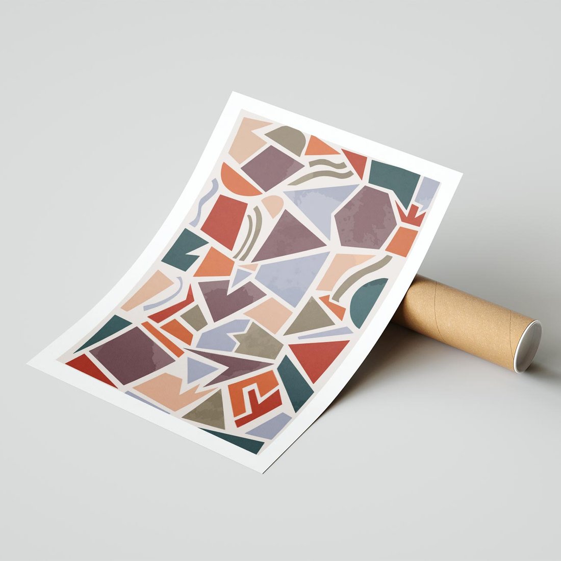 Ten nowoczesny plakat przedstawia geometryczne kształty układające się w mozaikę z różnokolorowych elementów. To połączenie abstrakcji i geometrycznego wzoru wprowadza do Twojej przestrzeni nowoczesność i oryginalność, tworząc jednocześnie interesujący akcent artystyczny.