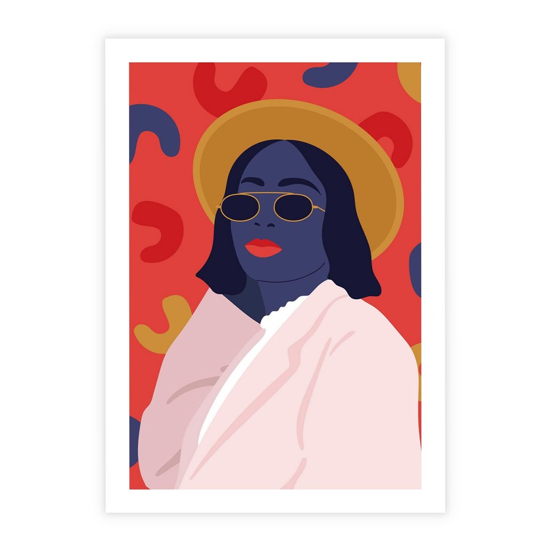 Nowoczesny plakat w stylu retro przedstawia kobietę w okularach słonecznych. Żywe kolory podkreślają jej styl i wyjątkowość, tworząc dynamiczną kompozycję pełną energii i osobowości.