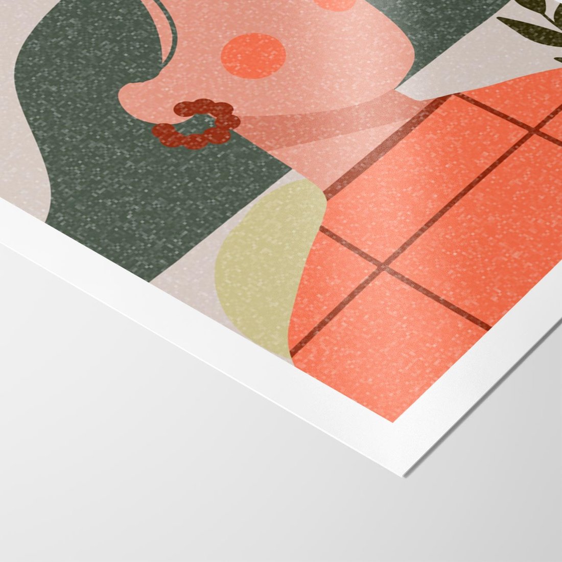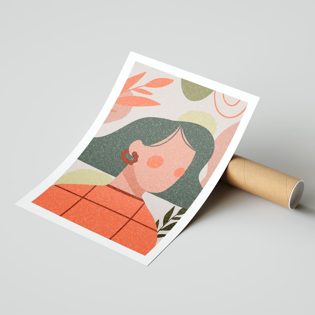 Nowoczesny plakat w stylu retro prezentuje portret kobiety w stonowanych kolorach. To połączenie klasycznego wdzięku z nowoczesnym stylem, tworząc wyrafinowaną kompozycję o subtelnych nawiązaniach do przeszłości.