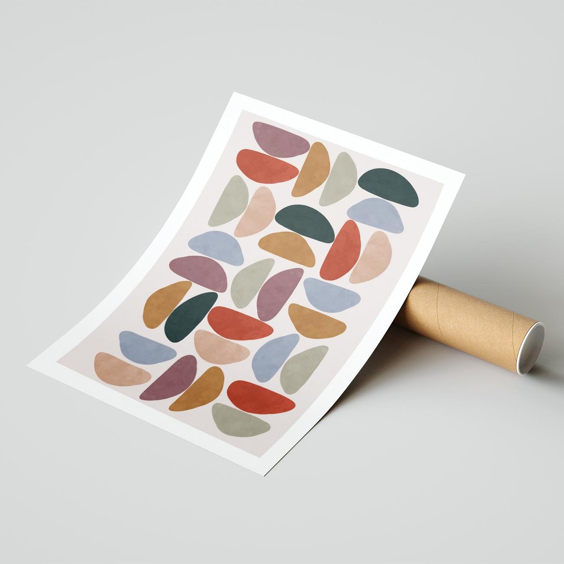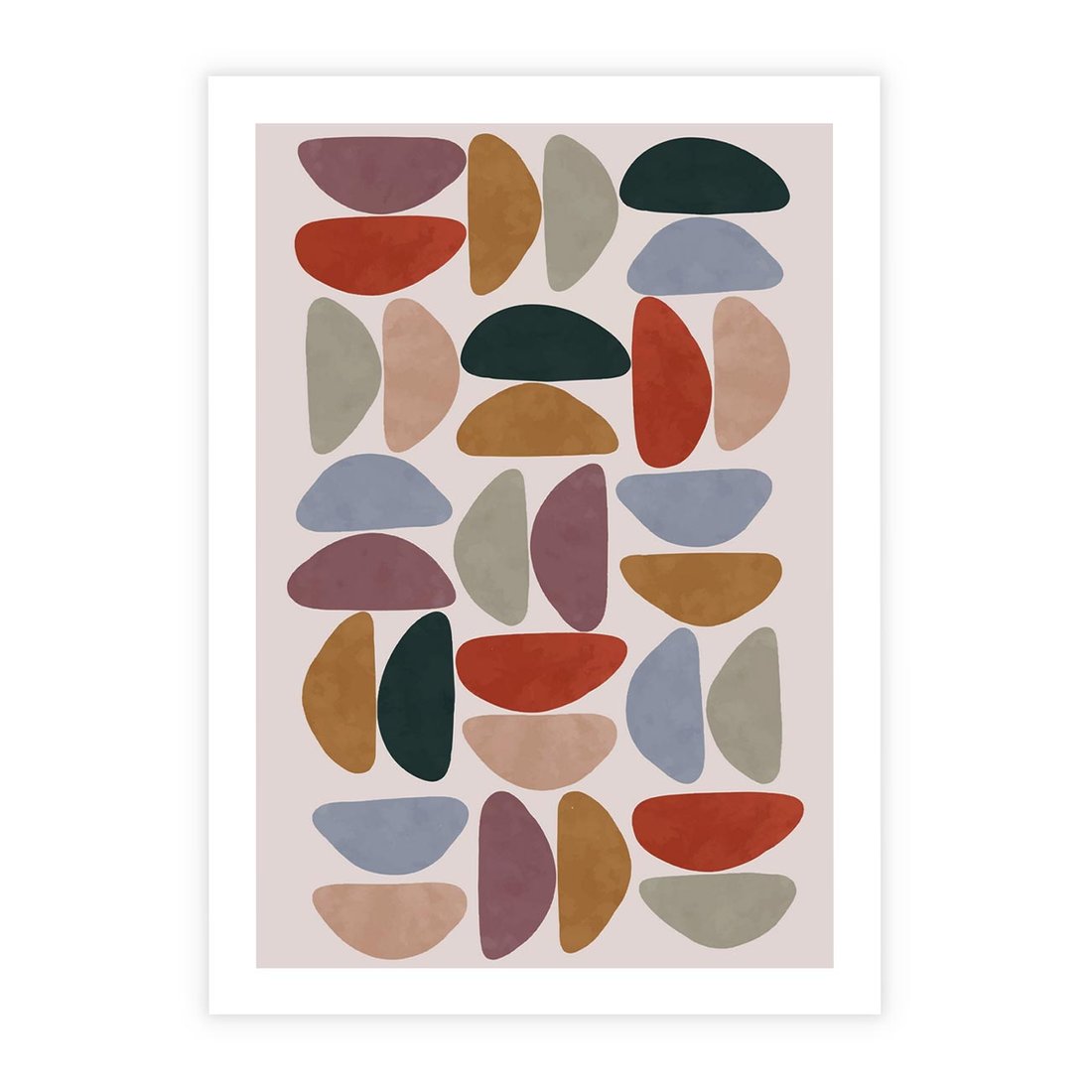 Ten abstrakcyjny obraz to harmonijna geometryczna kompozycja w stylu boho. Wyróżniają się na nim różnorodne kształty i wzory, tworząc unikalny plakat, który dodaje wyjątkowego charakteru i artystycznego ducha do każdego wnętrza.