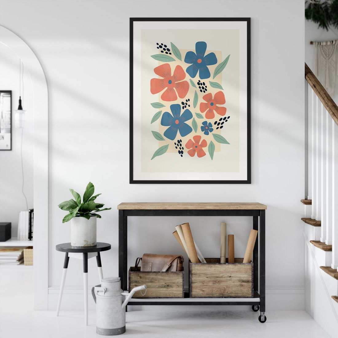 Ten plakat w nowoczesnej abstrakcji odkrywa piękno kwiatów, balansując z delikatną typografią. Kompozycja oddaje wyjątkową estetykę natury i sztuki, tworząc inspirującą przestrzeń.