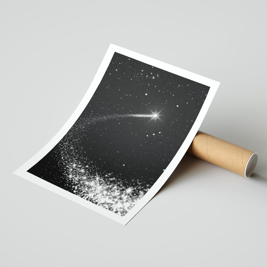 Odkryj tajemniczość kosmosu dzięki temu uroczemu obrazowi przedstawiającemu kometę wśród gwiazd. Z połyskującymi punktami światła i głęboką przestrzenią, ożywia przestrzeń. Ta kompozycja dodaje magicznego nastroju i tęsknoty za nieznanym, idealna dla miłośników astronomii i kosmicznych pejzaży.