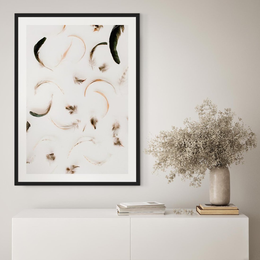 To minimalistyczna kompozycja piór, która kładzie nacisk na prostotę i elegancję. Pióra tworzą spokojny i delikatny obraz.