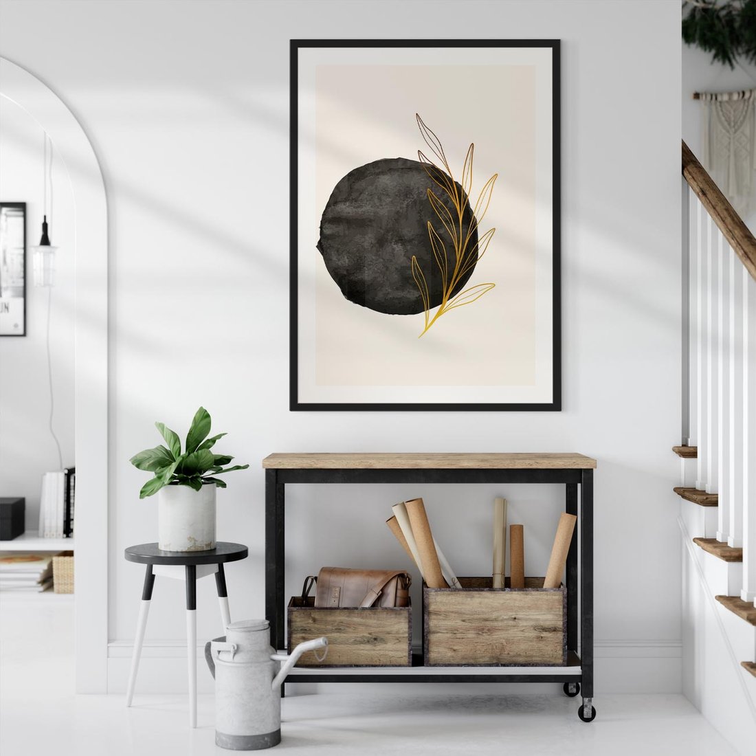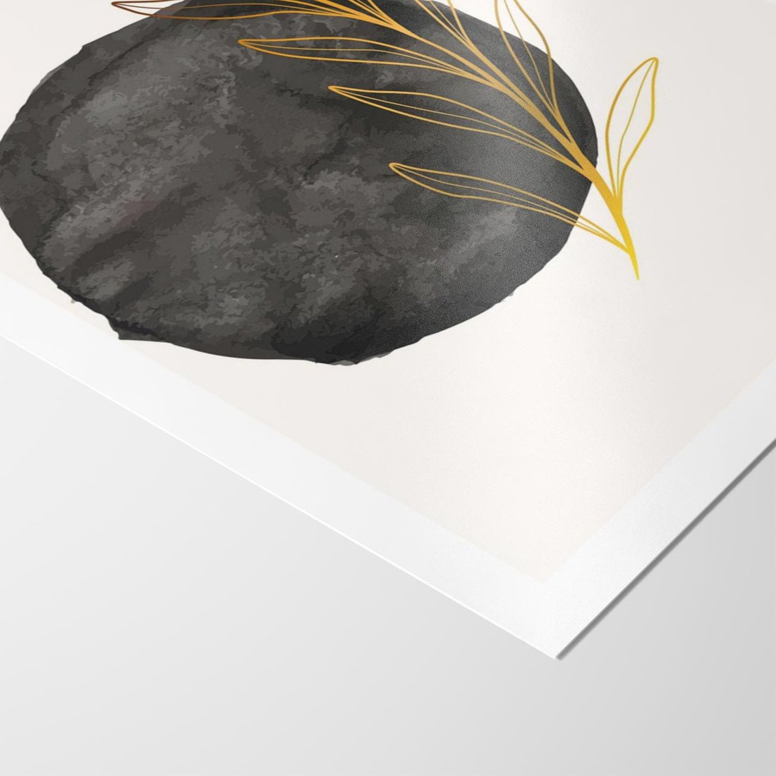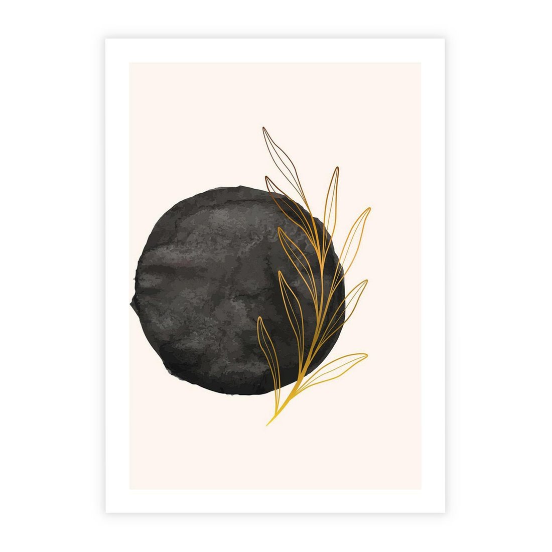 To minimalistyczna grafika, w której dominuje czarna plama, a złota gałązka dodaje delikatnego kontrastu. Ta kompozycja przyciąga uwagę swoją prostotą i elegancją.