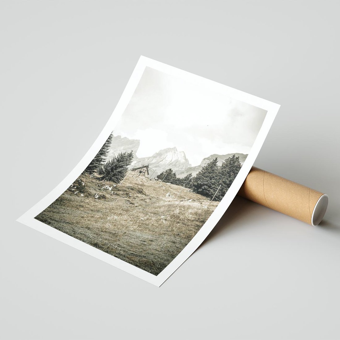 Plakat bez ramy 50x70 - Krajobraz Sepii: Domek w Górach - domek w górach, góry