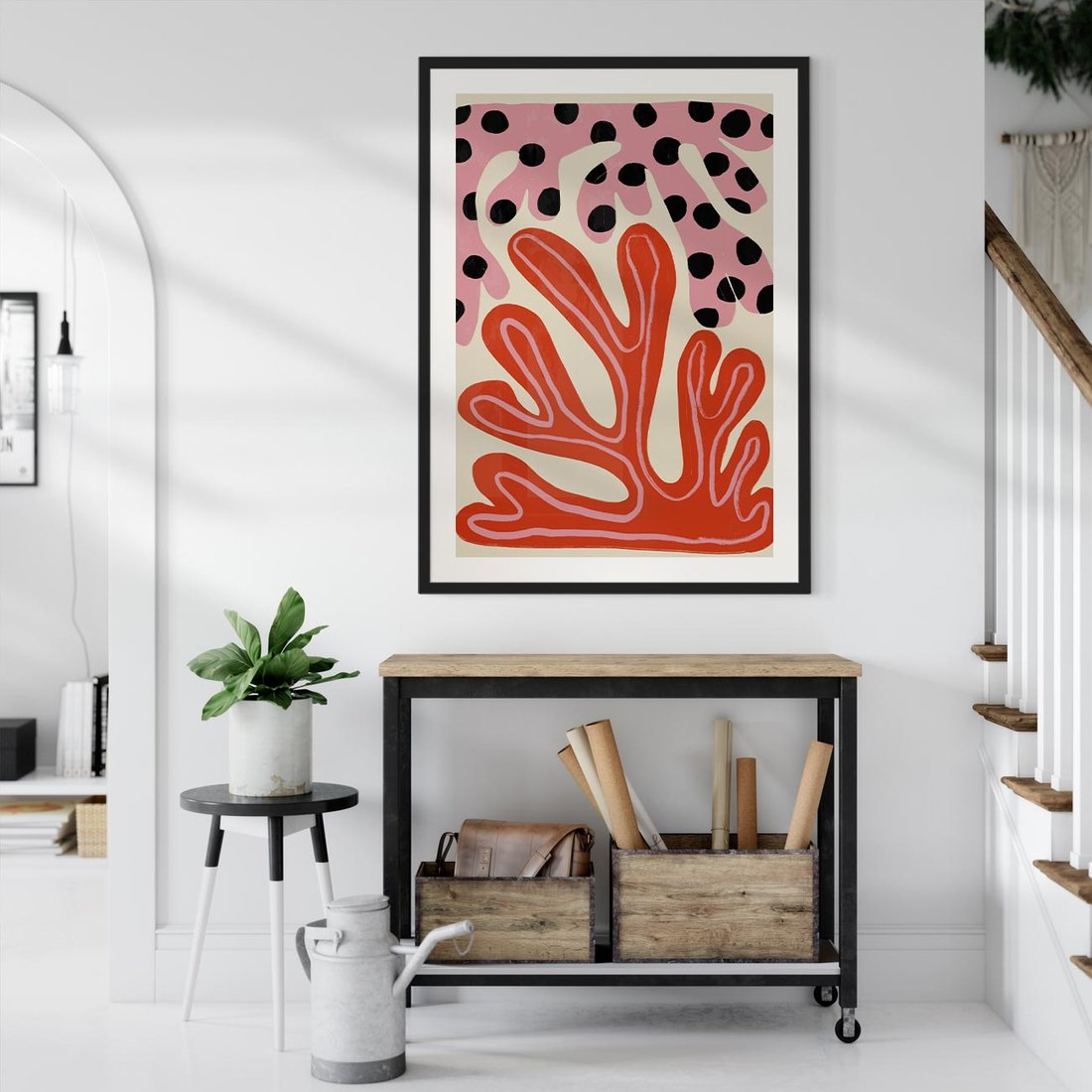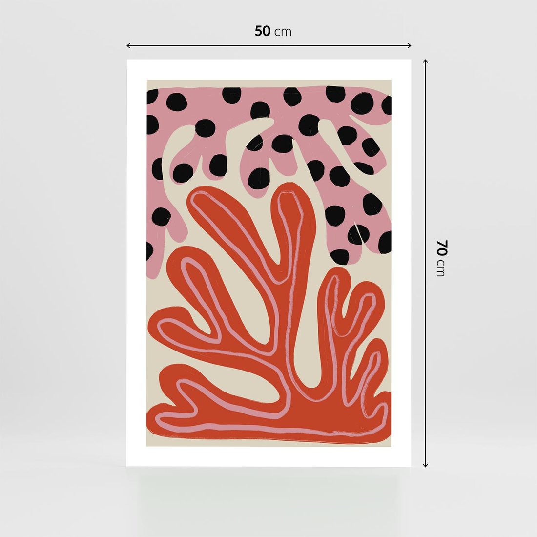 Ten abstrakcyjny obraz w formie plakatu fascynuje dziwnymi kształtami, które tworzą harmonię w odcieniach różowego i czerwonego. Jego wyjątkowość polega na zdolności zachęcania do refleksji, pobudzając wyobraźnię widza poprzez niekonwencjonalne kompozycje i intensywne barwy.