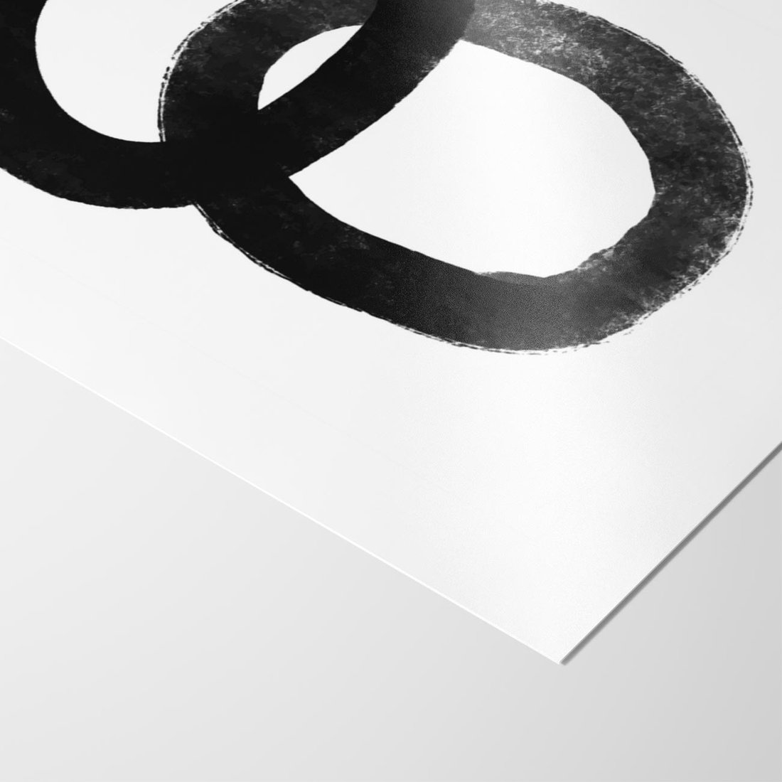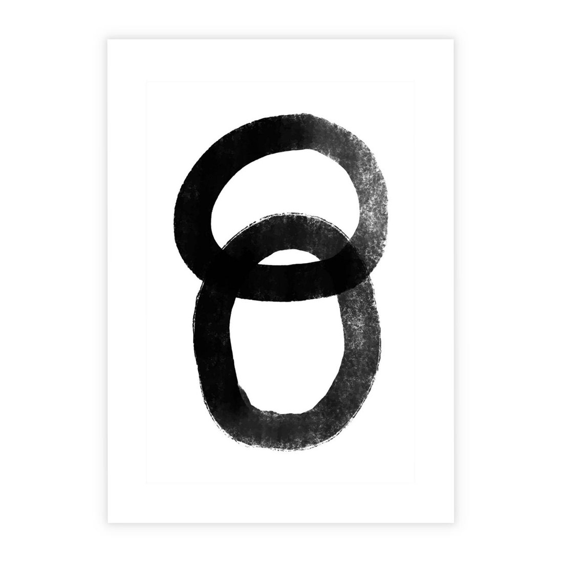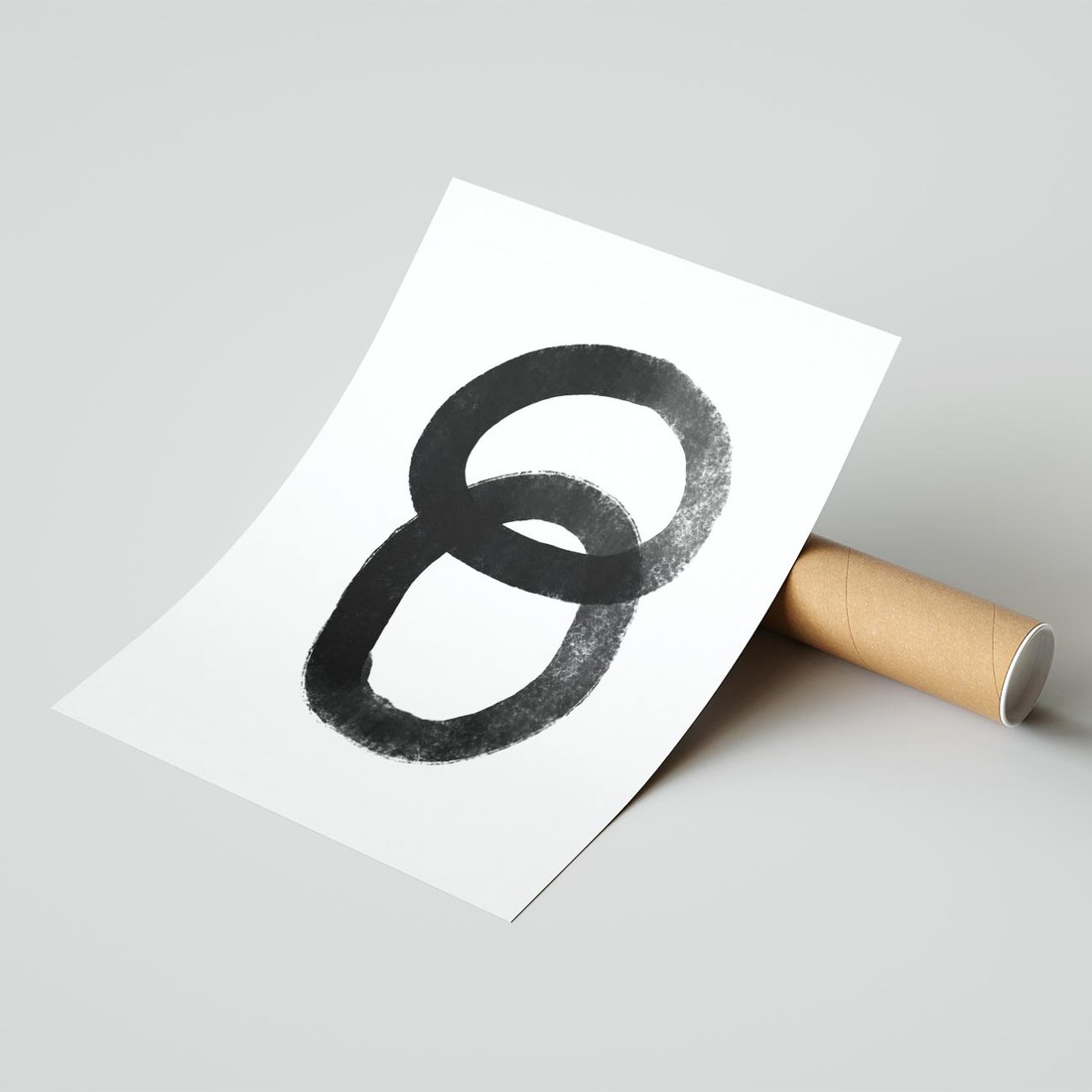To abstrakcyjne dzieło sztuki w stylu minimalizmu i modern artu prezentuje czarne koła zaplecione w dynamiczną kompozycję. Jego proste, ale wyraziste formy oddają nowoczesny charakter, doskonale pasując do różnych przestrzeni i wzbogacając wnętrza o oryginalność.