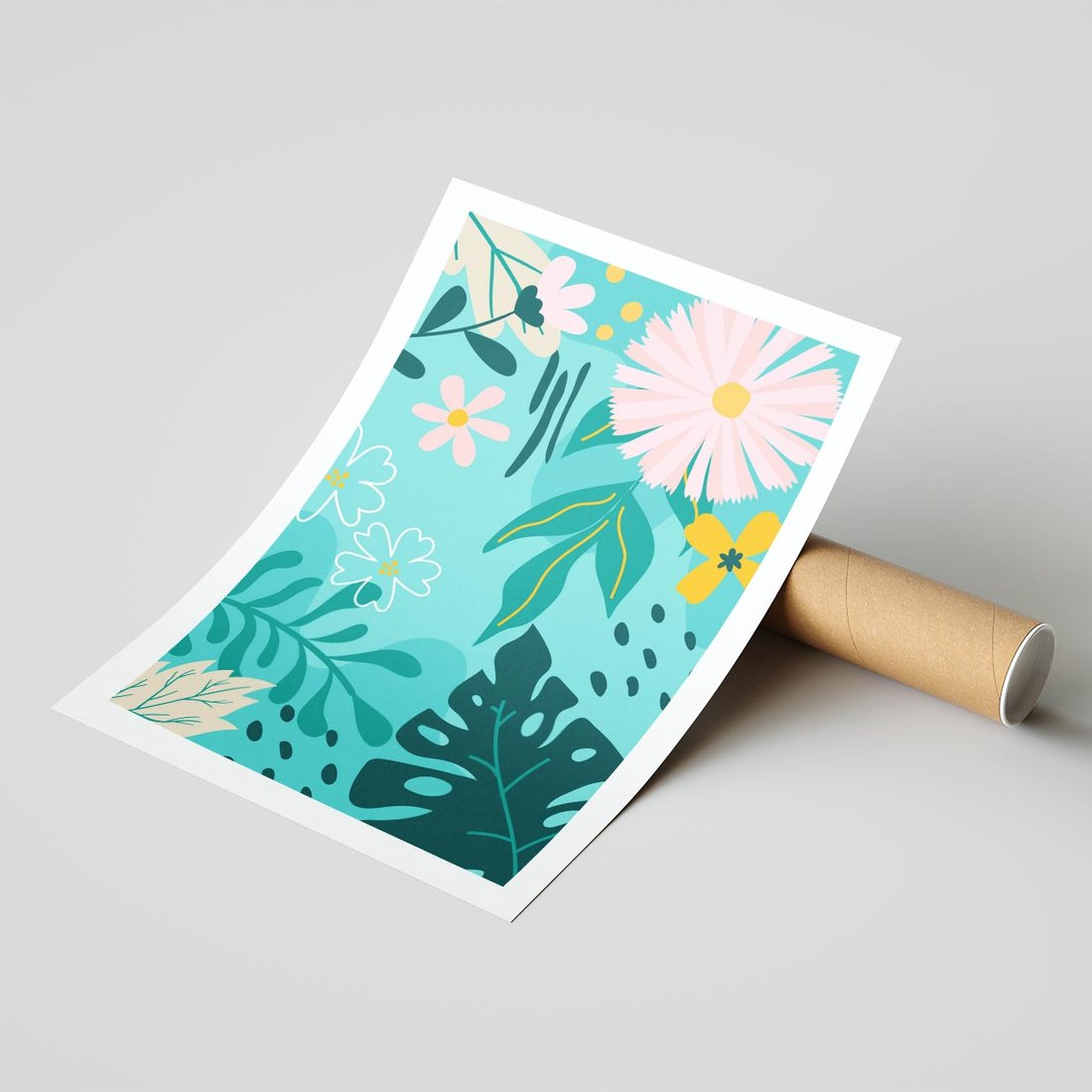 Pastelowa kompozycja z tropikalnymi liśćmi i kwiatami w odcieniach turkusu i różu. To wizualna podróż do tropikalnego raju, dodająca subtelności i koloru Twojej przestrzeni.