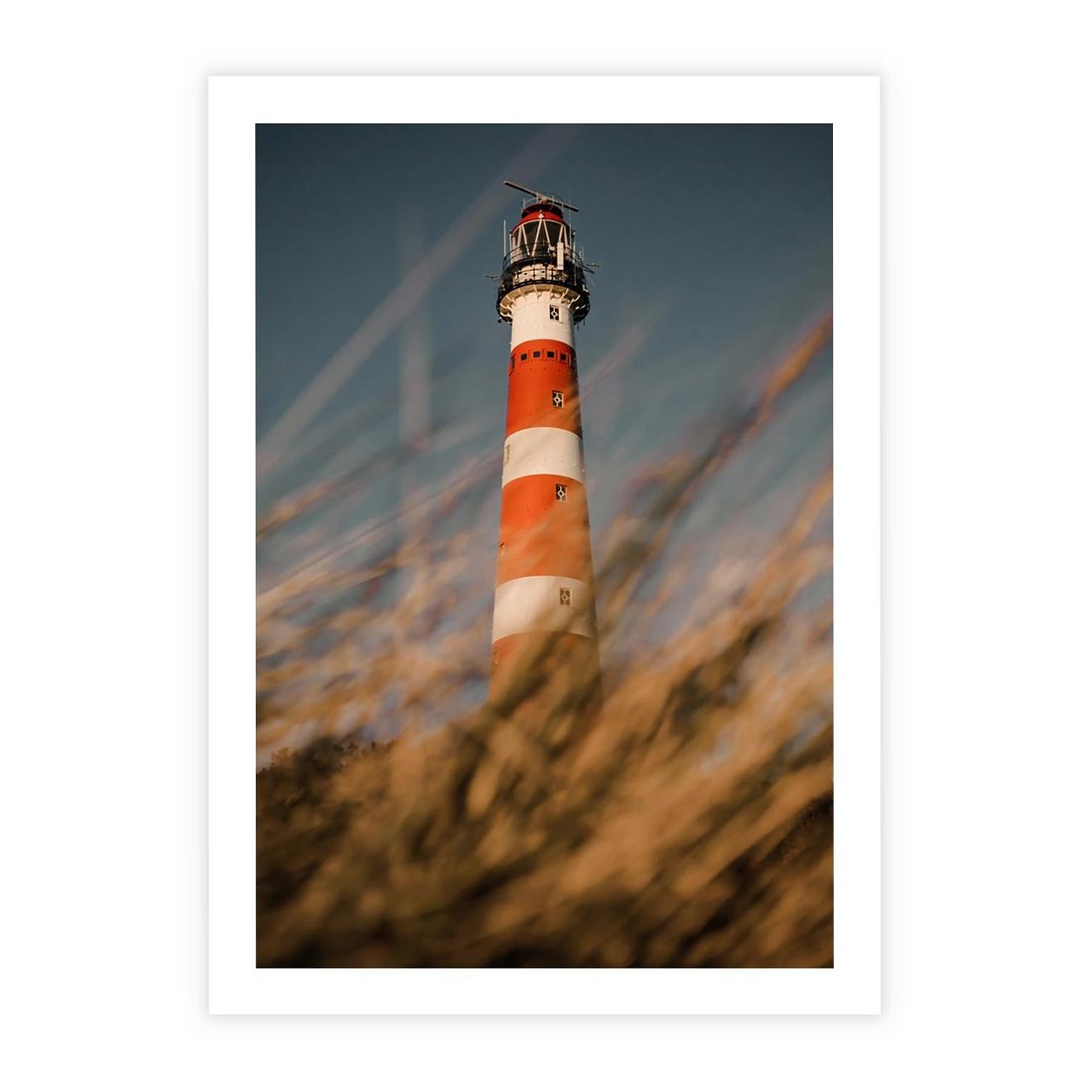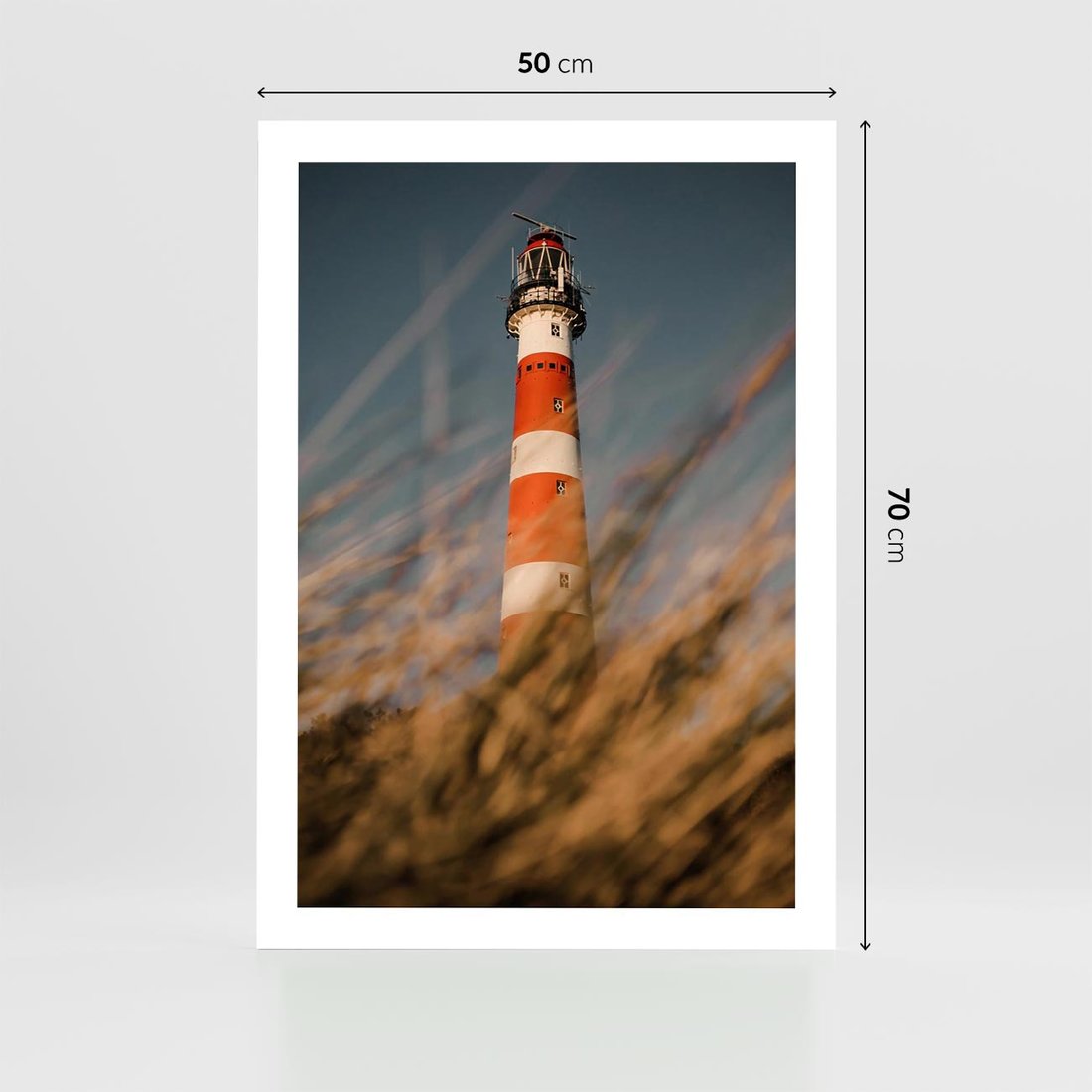 Plakat bez ramy 50x70 - Magia nadmorskiego światła - latarnia morska, ujęcie z za trawy