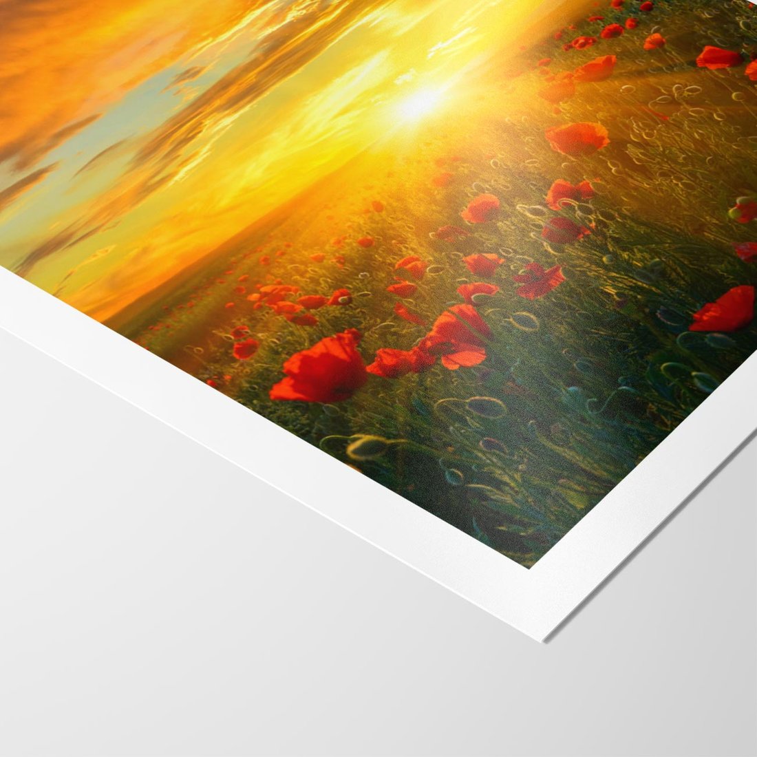 Ożyw swoje wnętrze tym ujmującym obrazem przedstawiającym magiczny zachód słońca na kolorowej łące pełnej maków. Soczyste kolory, delikatne płatki i złote promienie tworzą malowniczą kompozycję. Ten obraz dodaje romantyzmu i odczucia piękna natury, idealny dla miłośników zachodów słońca i kwiatów.