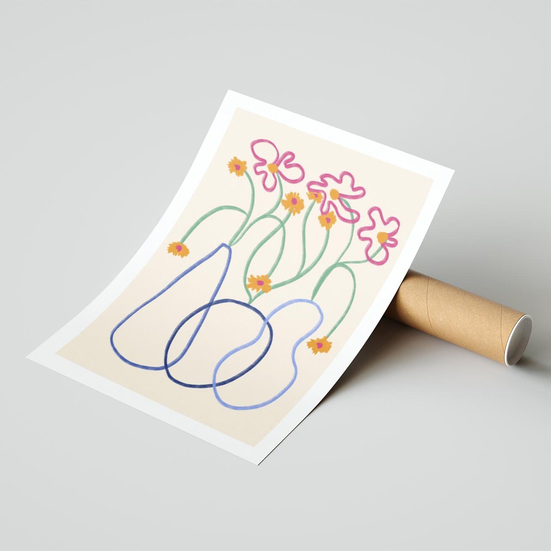 Ten minimalistyczny abstrakcyjny obraz prezentuje prymitywne kwiatki za pomocą delikatnych, kolorowych linii. Kompozycja jest subtelna, a jednocześnie pełna wyrazu, tworząc unikalne połączenie prostoty i artystycznego wyrazu. To idealny dodatek do nowoczesnych wnętrz, dodający im charakteru i oryginalności.