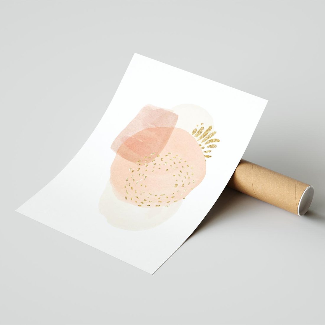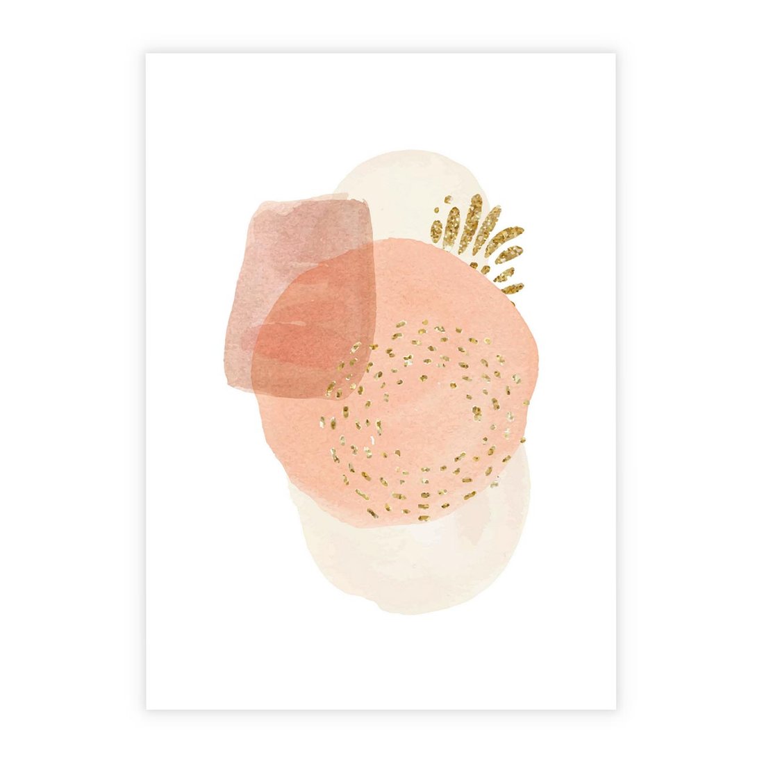 Minimalistyczna kompozycja abstrakcyjnych akwarelowych plam w stonowanych pastelach, ozdobiona subtelnie złotymi elementami. To wyrafinowane dzieło sztuki, które w prostocie wyraża piękno i harmonię.