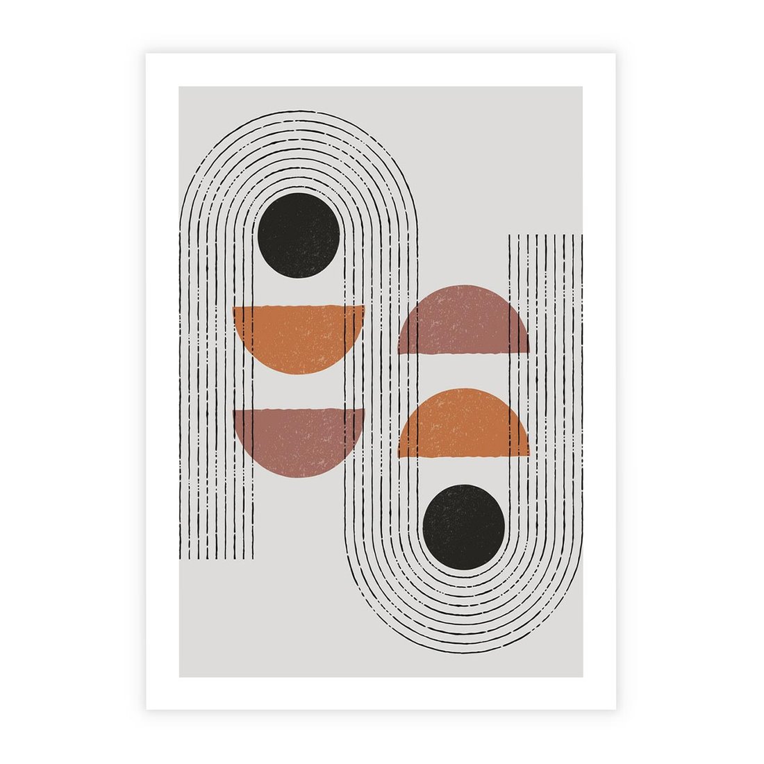 Nasza grafika to wyraz nowoczesności i estetyki geometrycznej. Ta kompozycja graficzna wykorzystuje geometryczne kształty i linie, tworząc unikalny obraz w duchu stylu modernistycznego. To idealna dekoracja, aby wprowadzić do swojego wnętrza nowoczesny design i geometrię.