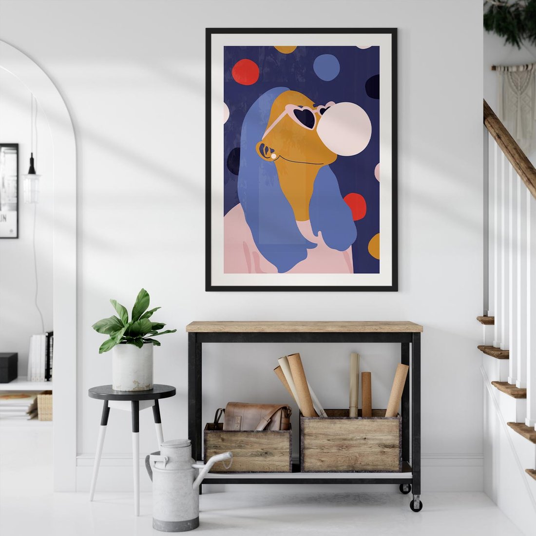 Nowoczesny plakat w stylu retro ukazuje kobietę, która z uśmiechem tworzy balony z gumy. To połączenie nostalgii i nowatorskiego designu, które przynosi wyjątkową atmosferę i radość do Twojego otoczenia.