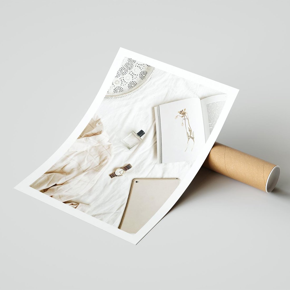 Obraz przedstawia kobiecą kompozycję z perfumami, książką i elementami mody. Ta kompozycja podkreśla elegancję i subtelność kobiecej estetyki i doskonale pasuje do wnętrz, które pragną wyrazić indywidualny styl i wyrafinowanie.