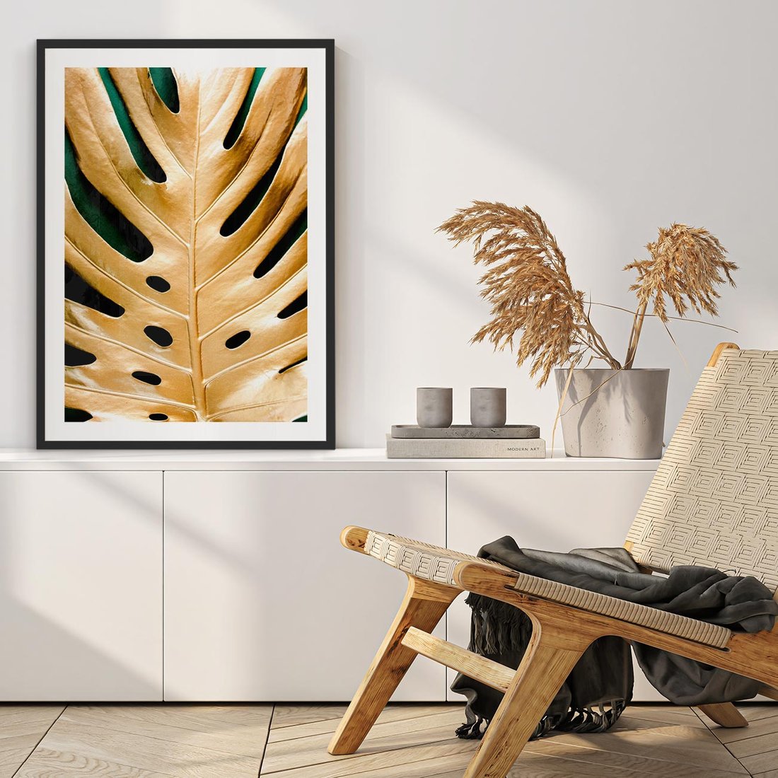 Odkryj piękno i styl złotych liści monstera na obrazie. Dodaj swojemu wnętrzu wyjątkowego uroku i odczuj elegancję, która emanuje z tej minimalistycznej kompozycji.