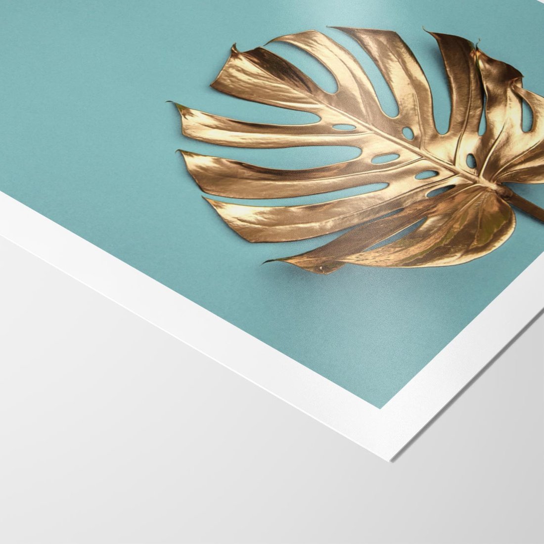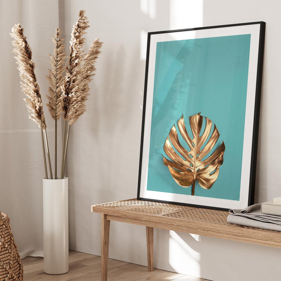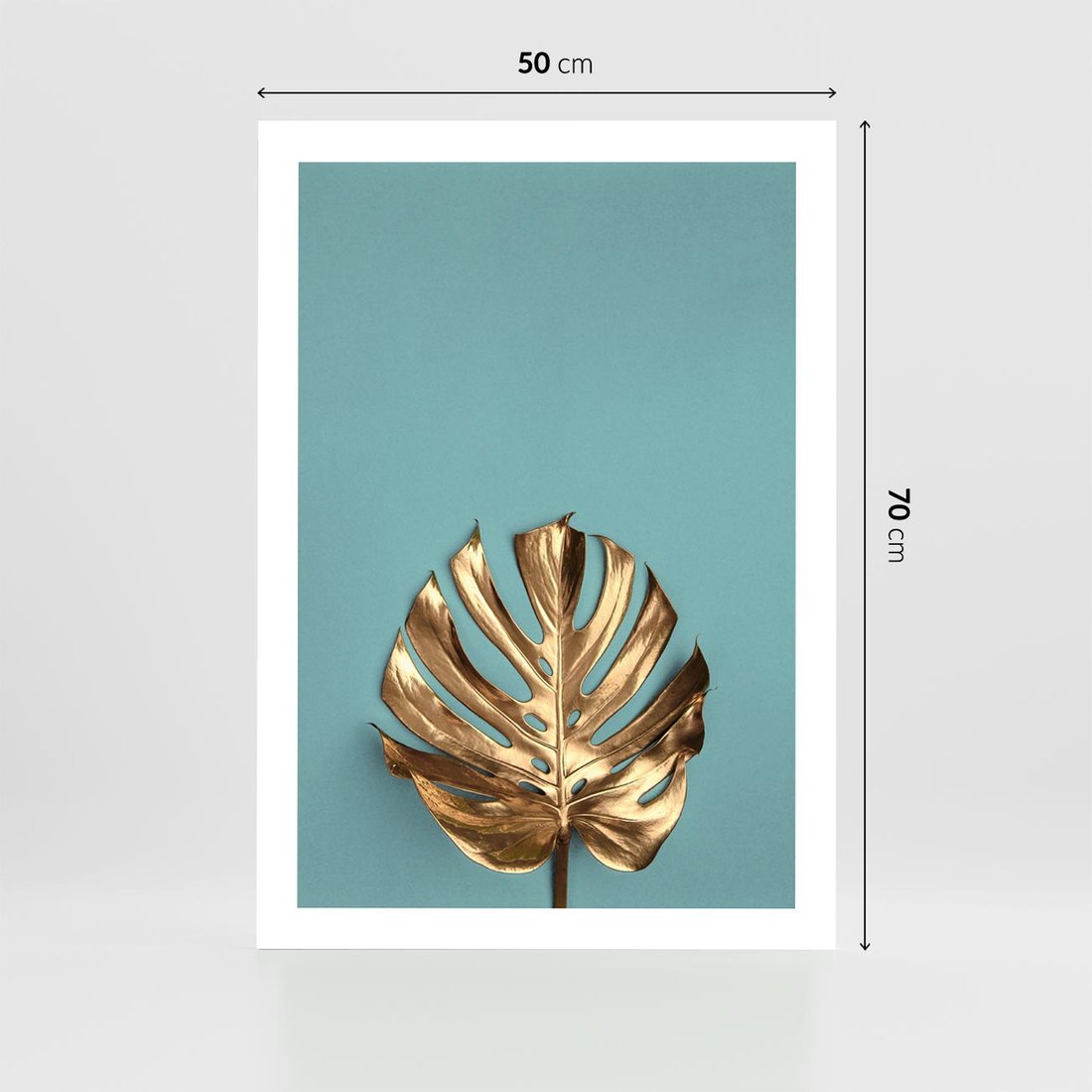 Przenieś piękno natury do swojego wnętrza za pomocą obrazu przedstawiającego złote liście monstera. Odczuj siłę i urok natury, które ożywają w tej minimalistycznej kompozycji.