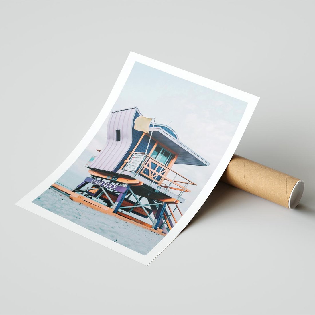 Plakat bez ramy 50x70 - Plażowa Kolorystyka: Budka Ratownika w Pastelach - pastelowa budka ratownika, plaża Miami