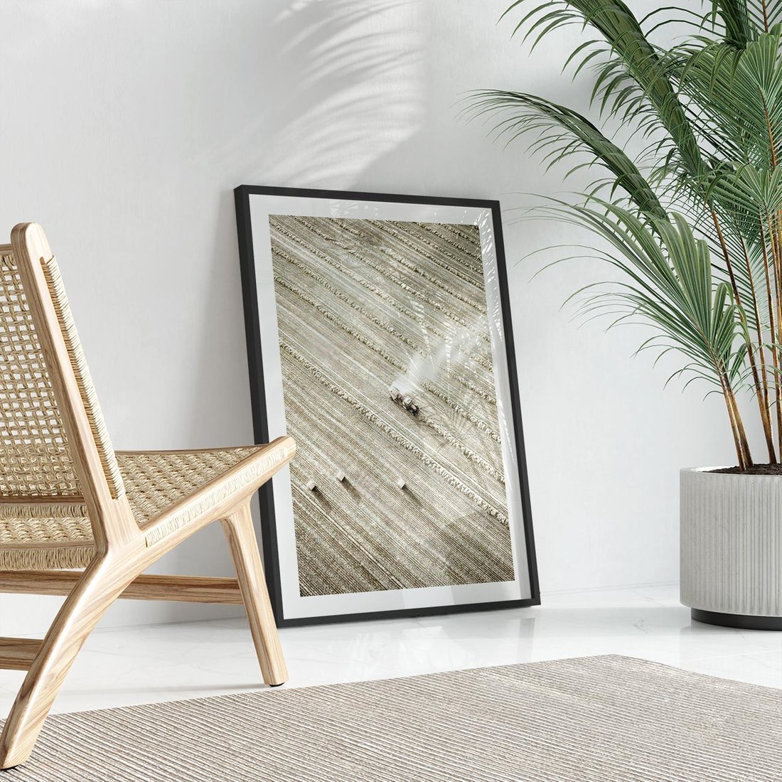 To jest rustykalne ujęcie pola w trakcie żniw, na którym pracuje traktor. Obraz ten oddaje siłę i tradycję rolnictwa.