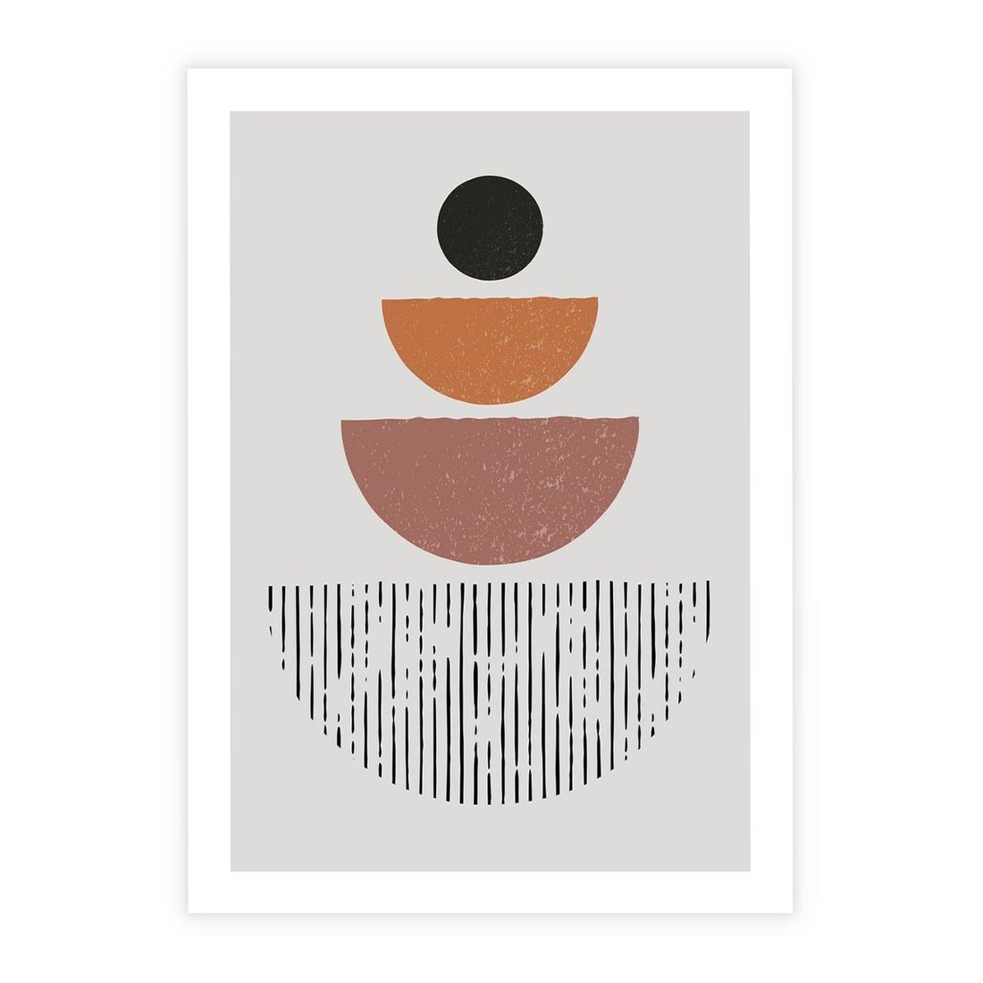 Obraz przedstawia geometryczną kompozycję półkół w stylu midcentury, który dodaje nutkę boho stylu. Ta kompozycja jest pełna wyrazu i elegancji.