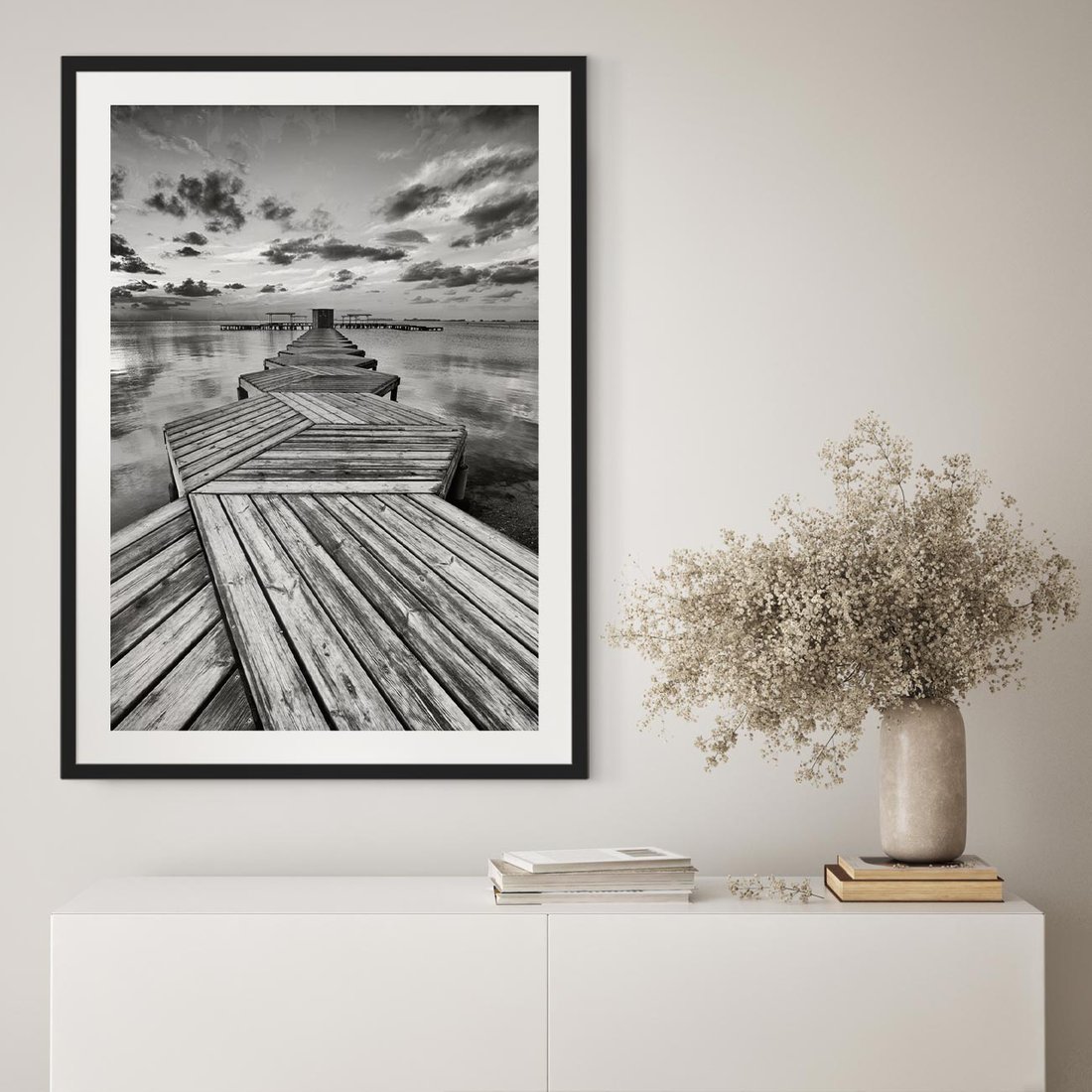 Przenieś się na spokojny pomost, który wznosi się nad falami morza na tym malowniczym obrazie. Jego harmonijne połączenie z naturą tworzy aurę spokoju i harmonii. Ta kompozycja dodaje relaksu i wyciszenia, idealna dla miłośników nadmorskich pejzaży i błogiego odpoczynku.
