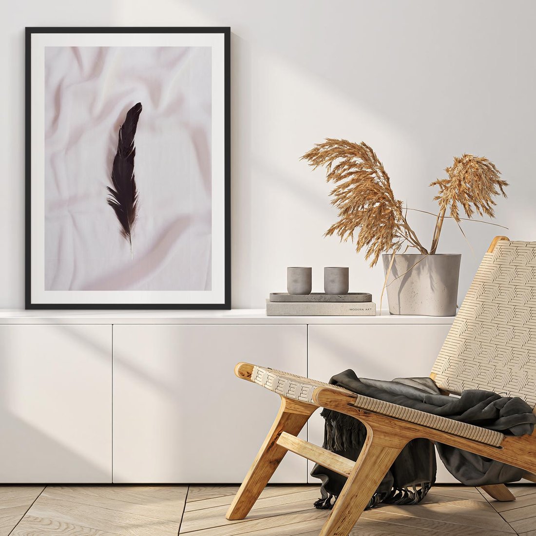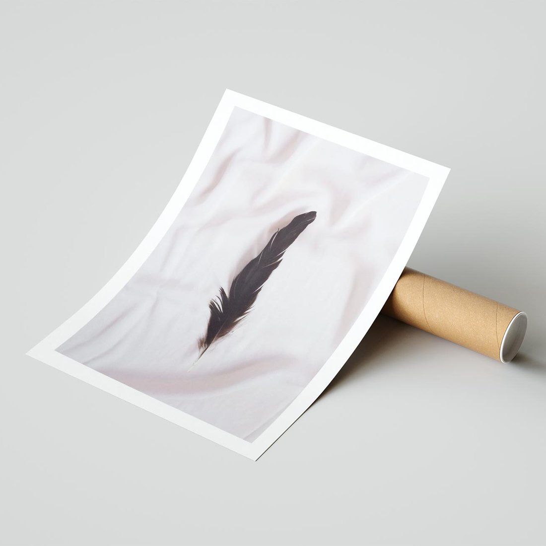 Plakat bez ramy 50x70 - Prosta Elegancja - czarne pióro na białej pościeli, minimalizm