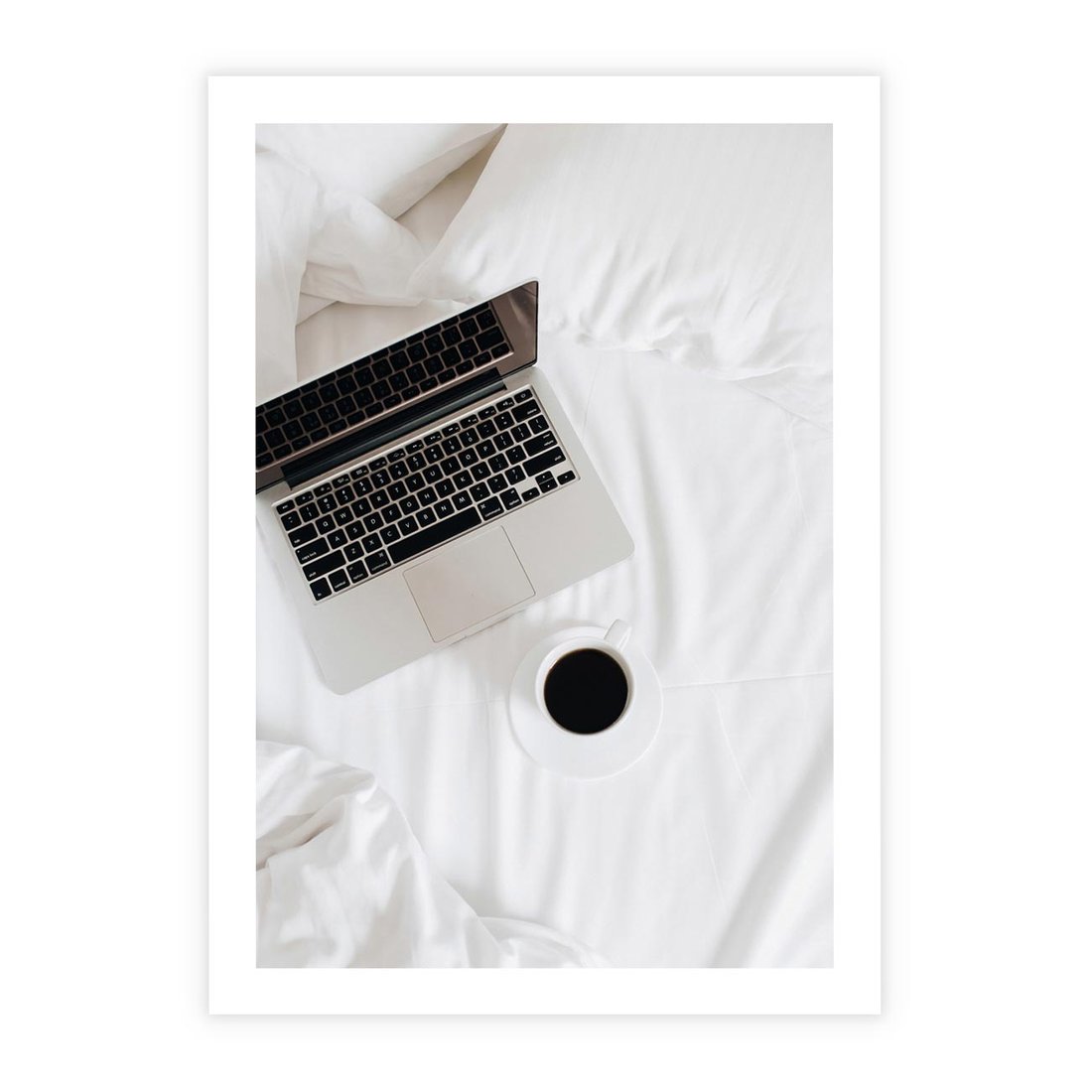 Plakat bez ramy 50x70 - Relaks w Łóżku: Kawa i Laptop w Pościeli - komputer, na łóżku