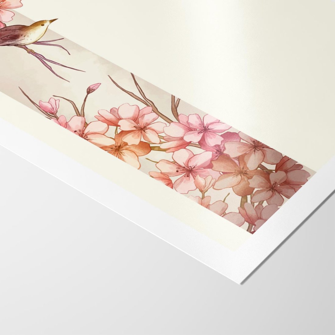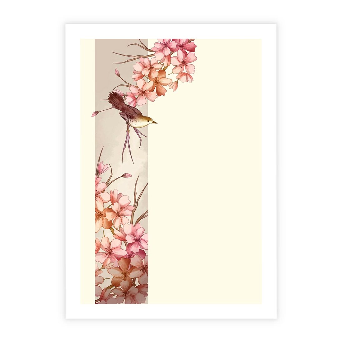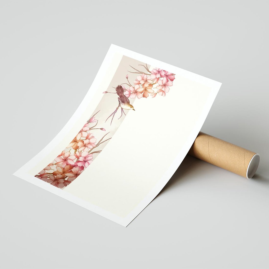 Japońska sztuka spotyka się z naturą w harmonii. Ptak i kwiat wiśni tworzą pejzaż inspirujący Japandi - połączenie spokoju i prostoty.