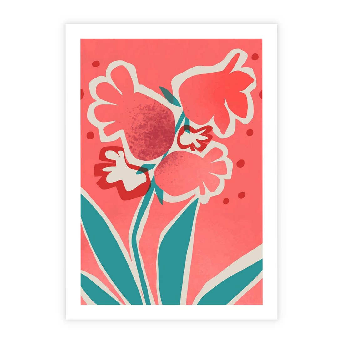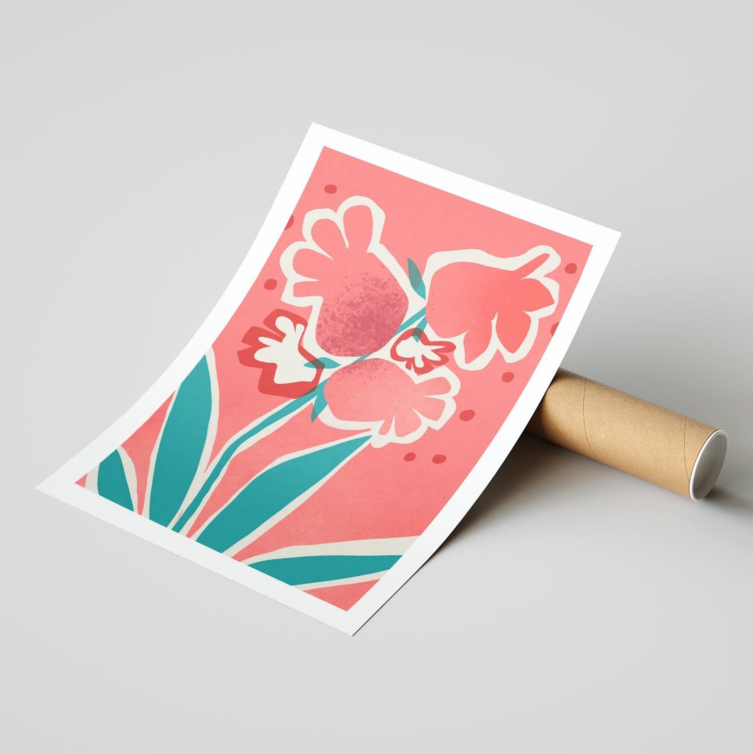 Nowoczesny plakat ukazujący abstrakcyjne kwiaty o odcieniach różu, tworzące dynamiczną i wyjątkową sztukę nowoczesną.