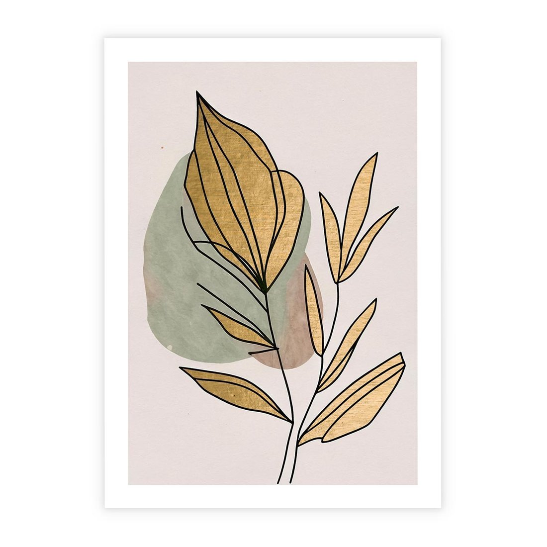 Ten abstrakcyjny obraz w stylu boho jest prawdziwym dziełem sztuki, gdzie liście łączą się z delikatnymi złotymi elementami, tworząc piękny kontrast i harmonię. Złote liście dodają elegancji i blasku, podkreślając naturalne piękno roślin. Kompozycja emanuje subtelnym urokiem i przytulnością, idealnie pasując do różnych wnętrz i dodając im wyjątkowego charakteru.