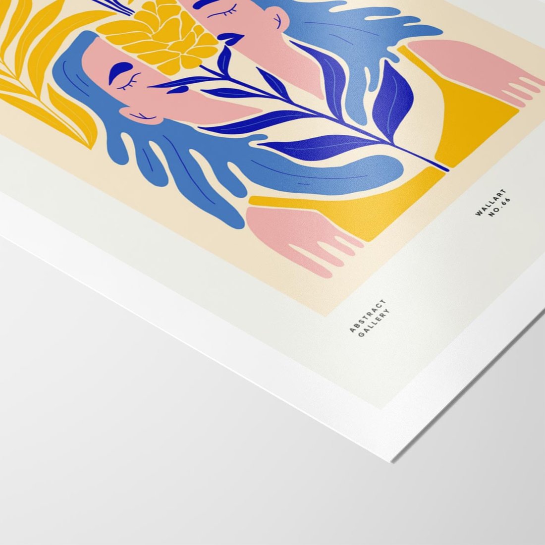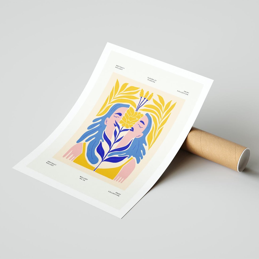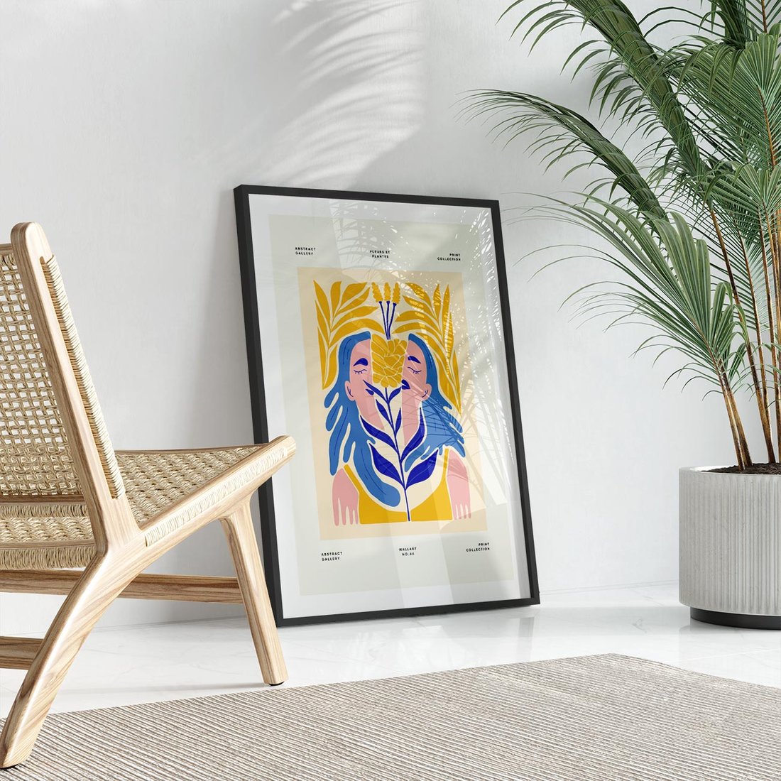 Ta nowoczesna sztuka łączy abstrakcyjne kwiaty z delikatnymi pastelowymi odcieniami, tworząc harmonijną kompozycję wokół postaci kobiecej. Inspirująca i pełna piękna refleksja nad naturą i kobiecością.