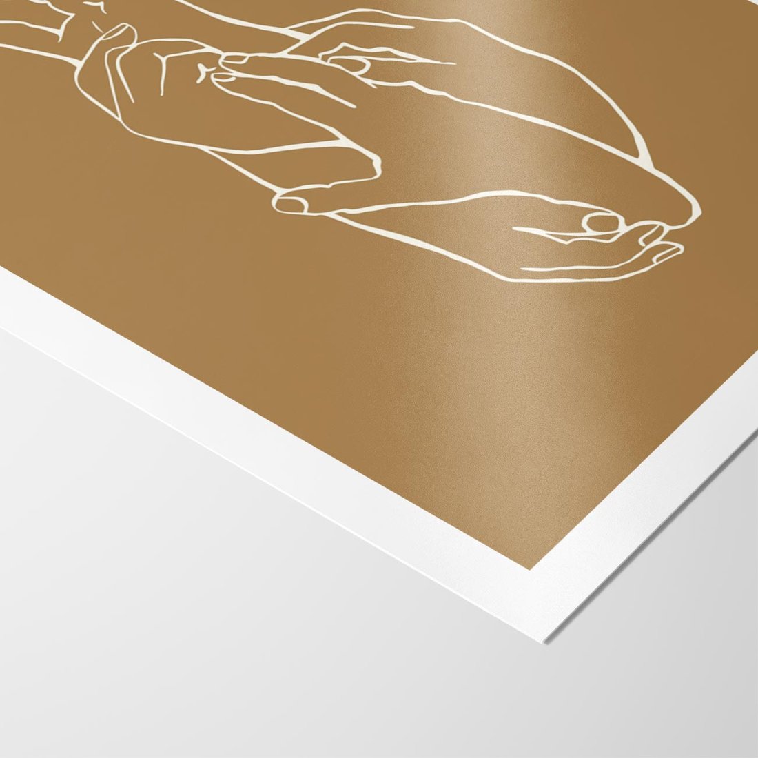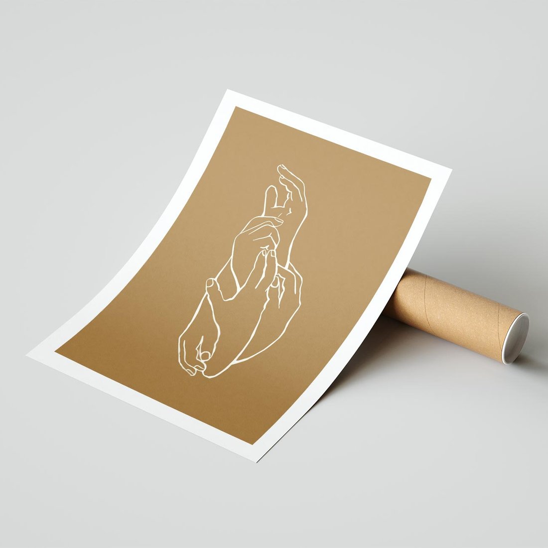 Ten szkic ukazuje splecione dłonie w minimalistycznym stylu, symbolizującą jedność. Przez zastosowanie prostoty i brązowego tła, sztuka ta oddaje esencję współdziałania i bliskości między ludźmi, tworząc spokojny i inspirujący akcent, który przypomina o wartościach wspólnoty w Twojej przestrzeni.
