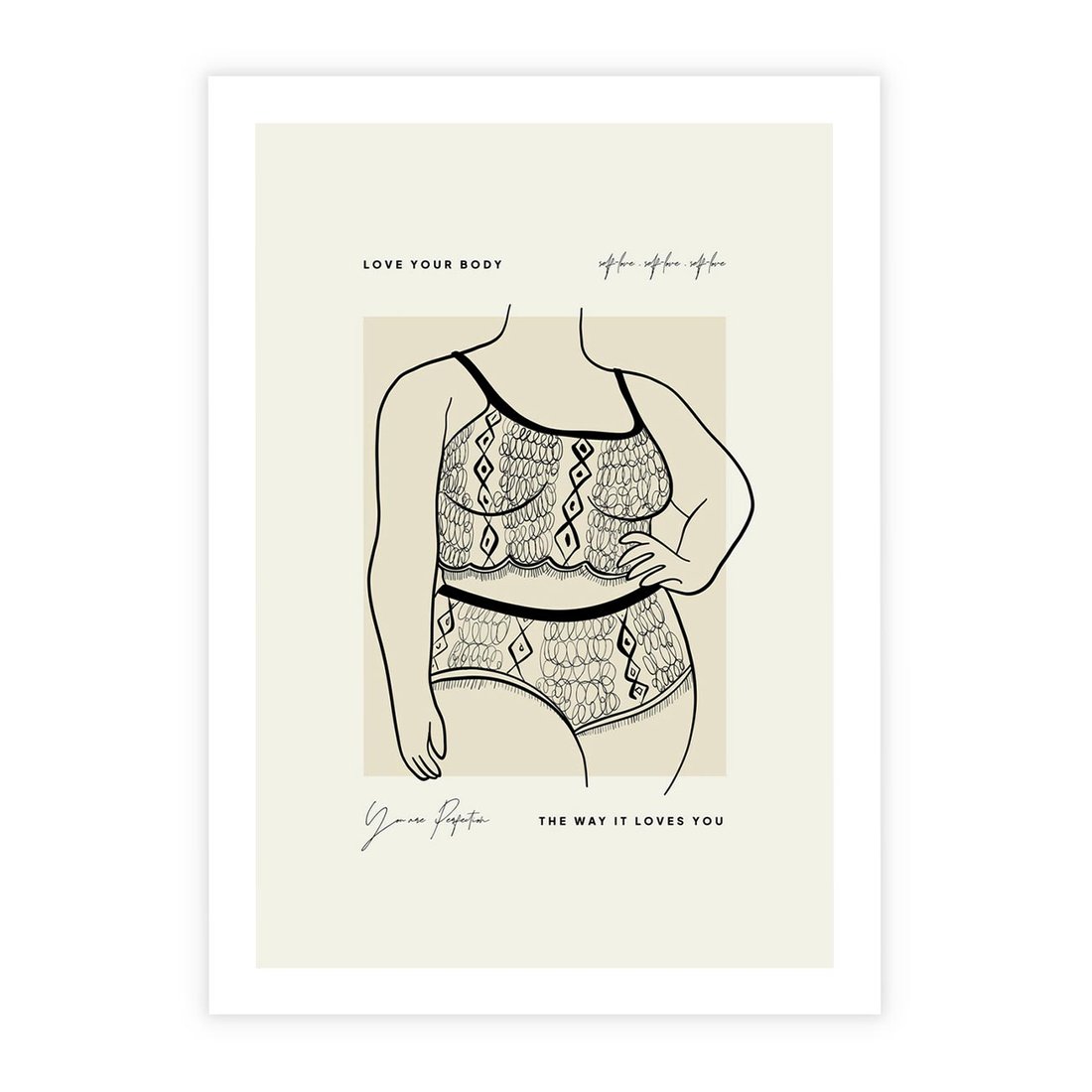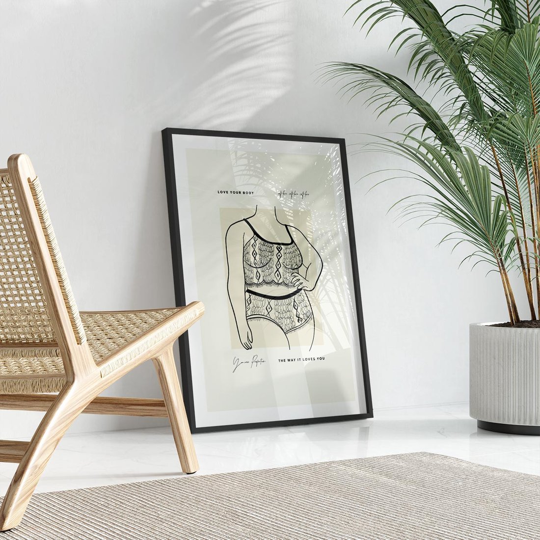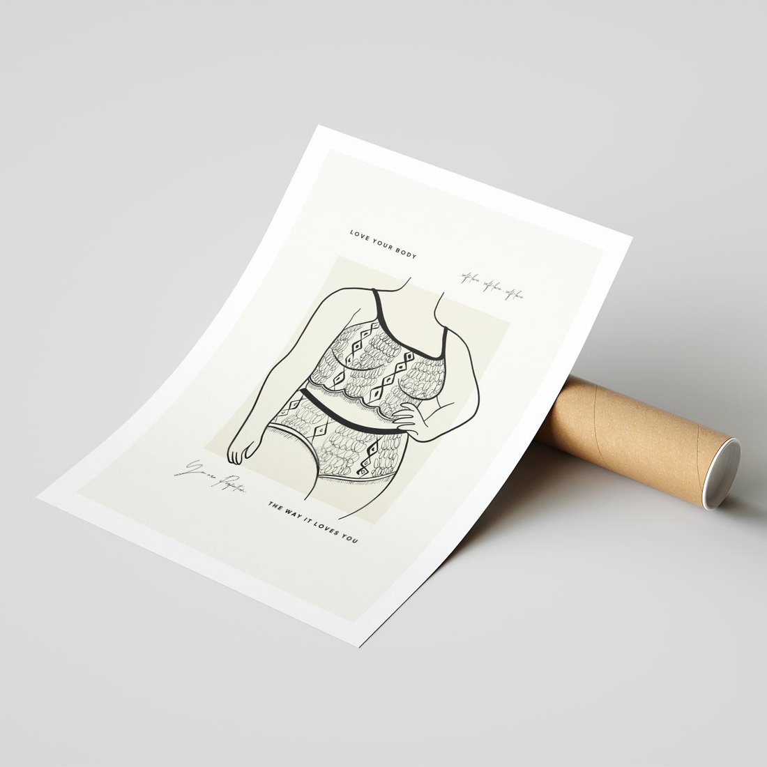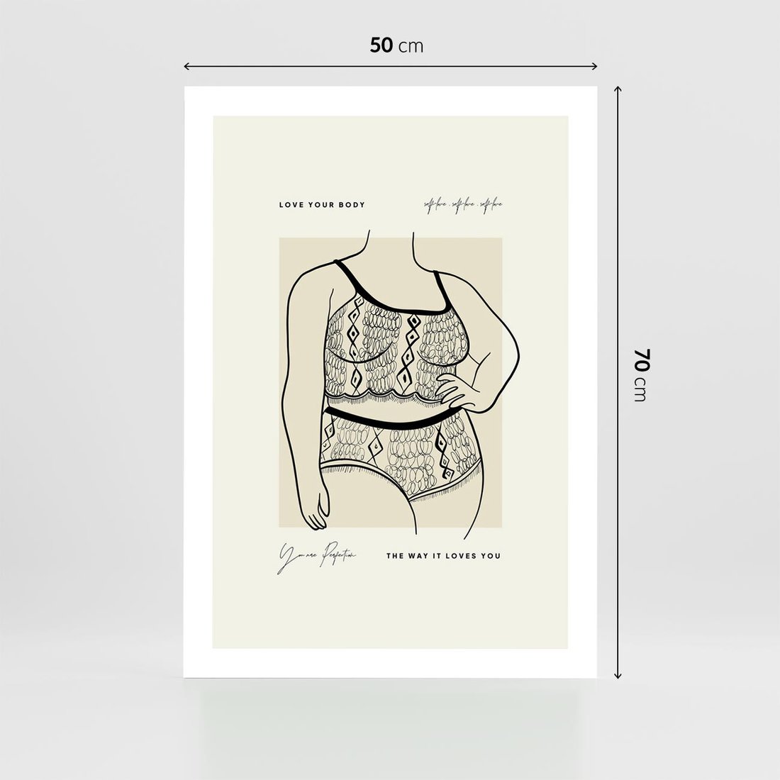 Ten plakat to hołd dla kobiecej siły i piękna. Delikatny rysunek kobiety w bieliźnie, wzbogacony subtelnie dobraną typografią, tworzy wyjątkową kompozycję, oddającą piękno i pewność siebie.