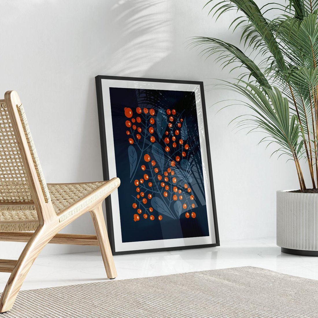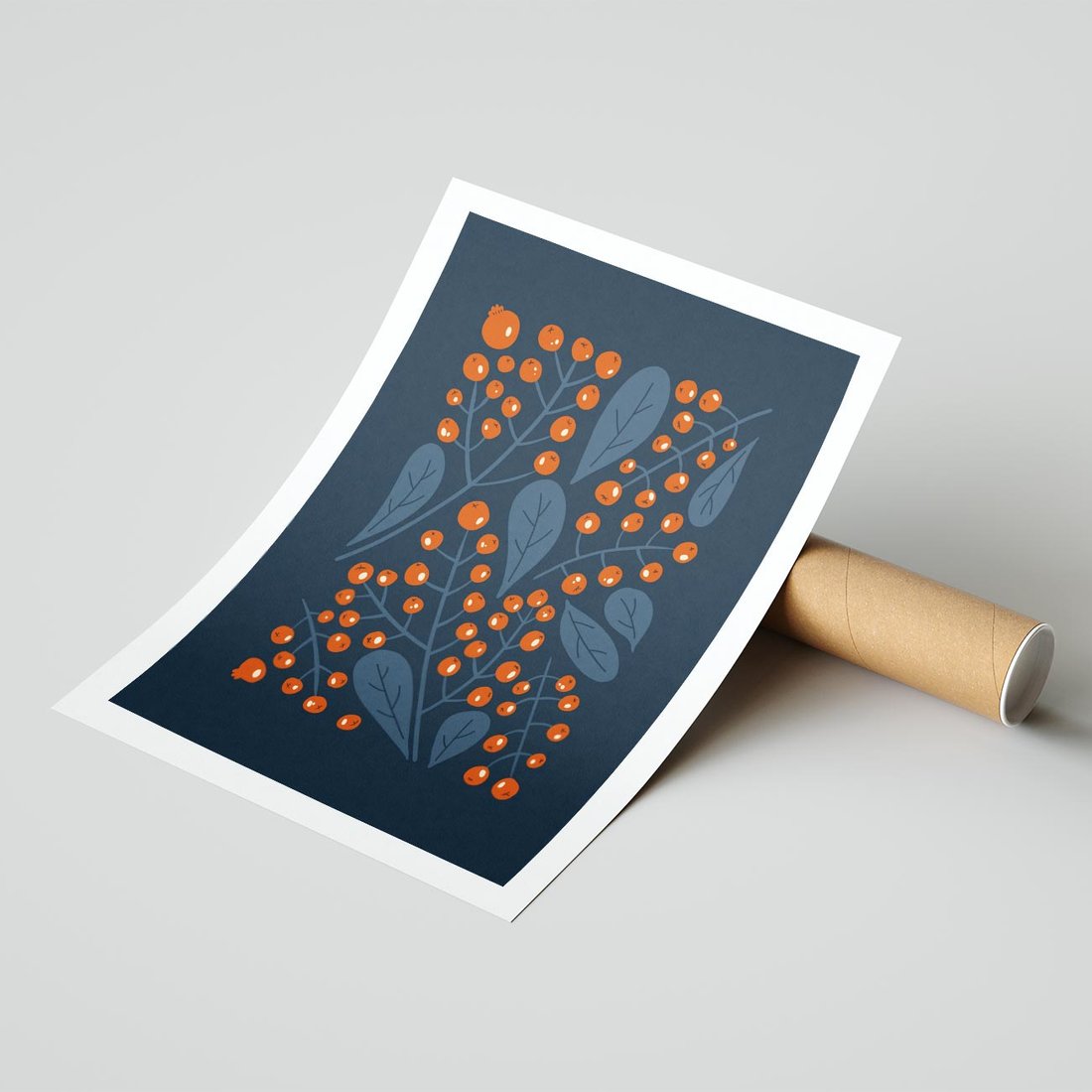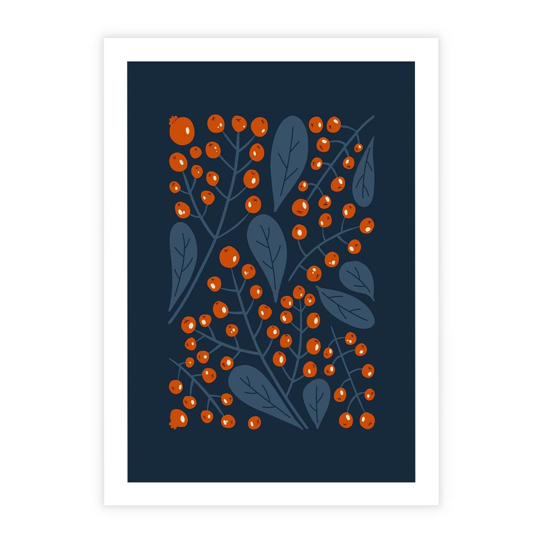 Plakat bez ramy 50x70 - Symfonia liści i owoców - granatowe tło, pomarańczowe owoce jarzębiny