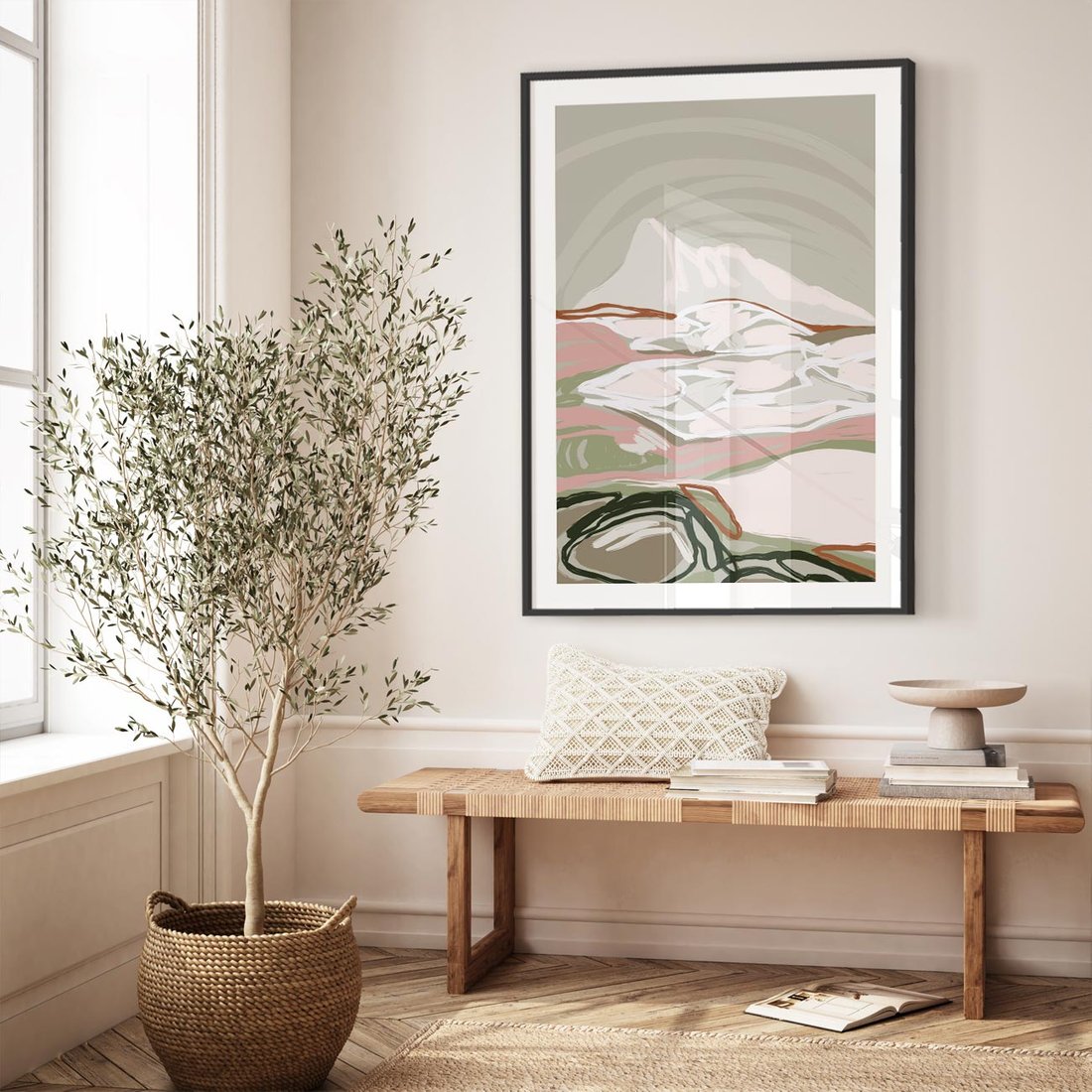 Ten nowoczesny plakat prezentuje pastelowy krajobraz z odcieniami szarości, które przypominają górskie szczyty. To dzieło sztuki wnosi do Twojej przestrzeni spokój i wrażenie przestronności, tworząc jednocześnie minimalistyczny i nowoczesny akcent. Idealny wybór dla miłośników krajobrazów i prostego designu.