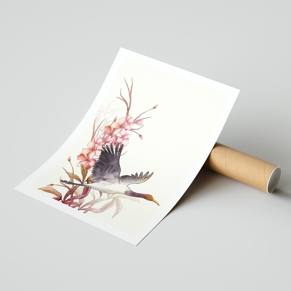 Wprowadź harmonię Japandi do swojego wnętrza z japońską sztuką przedstawiającą ptaka i kwiat wiśni. To spokojne połączenie, które przyniesie równowagę i estetykę natury do Twojego otoczenia.