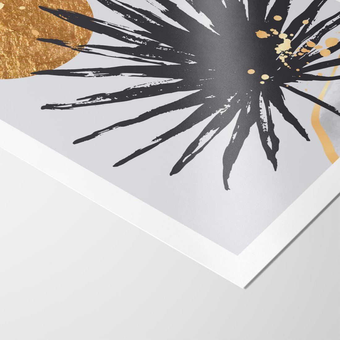 To jest czarna grafika przedstawiająca palmę, w której centralnym punktem jest złote koło. Grafika ta łączy w sobie egzotyczny motyw palmy z elementem złotej dekoracji.