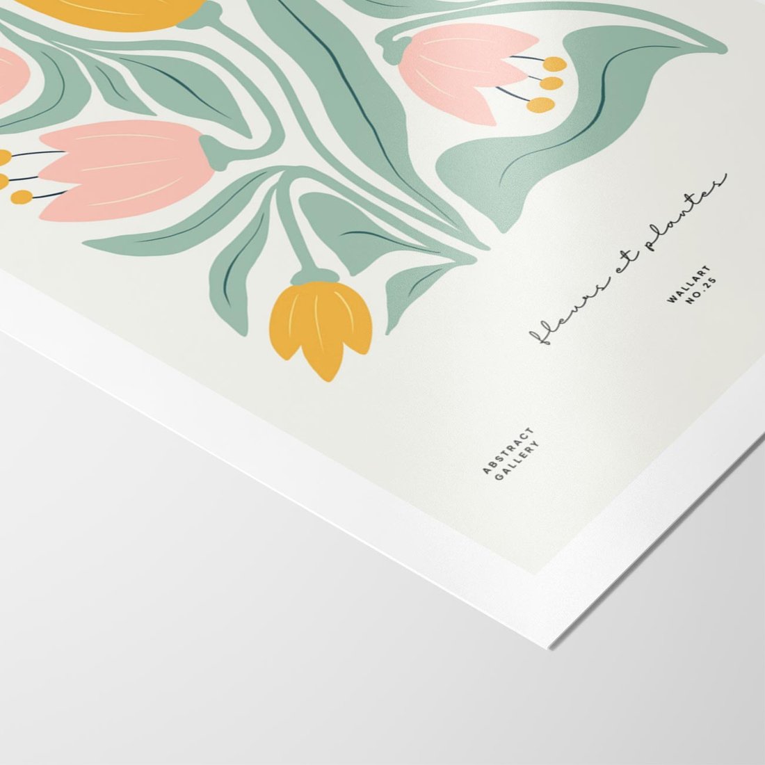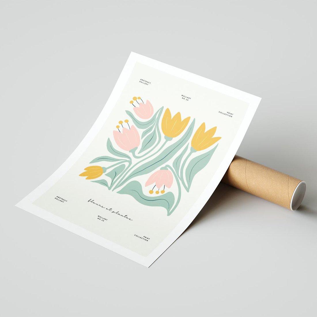 Ten plakat w nowoczesnej abstrakcji przywołuje piękno kwiatów w pastelowych tonach, w harmonii z delikatną typografią. Kompozycja tworzy subtelne i spokojne wrażenie, zachęcając do odkrywania piękna natury.
