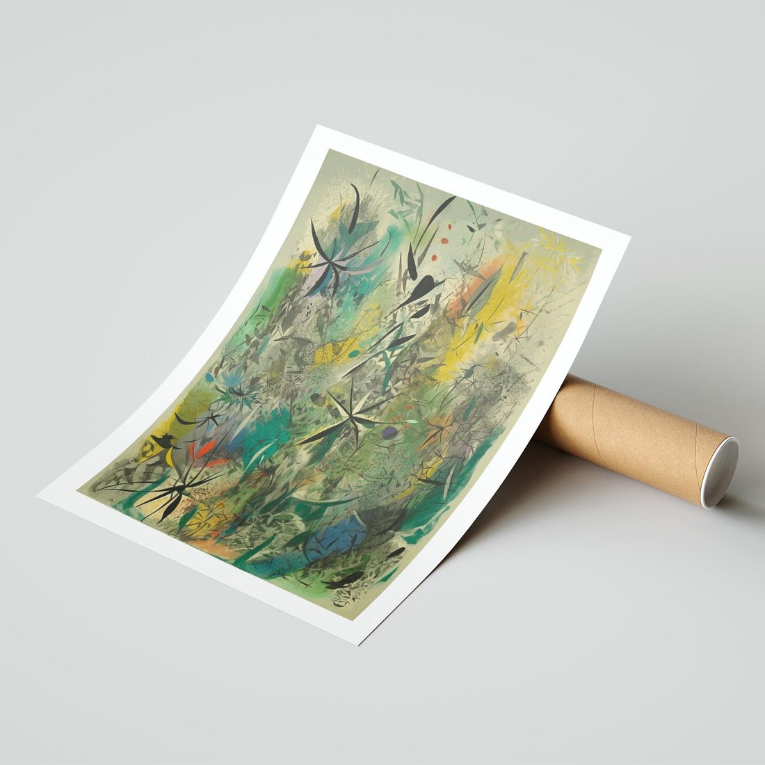 Ten abstrakcyjny obraz to prawdziwa eksplozja kolorów i małych, zawiłych elementów. Ich kształty tworzą harmonijną całość, wzbogaconą o roślinne motywy. Ciekawa i intrygująca kompozycja przyciąga uwagę i inspiruje do refleksji.
