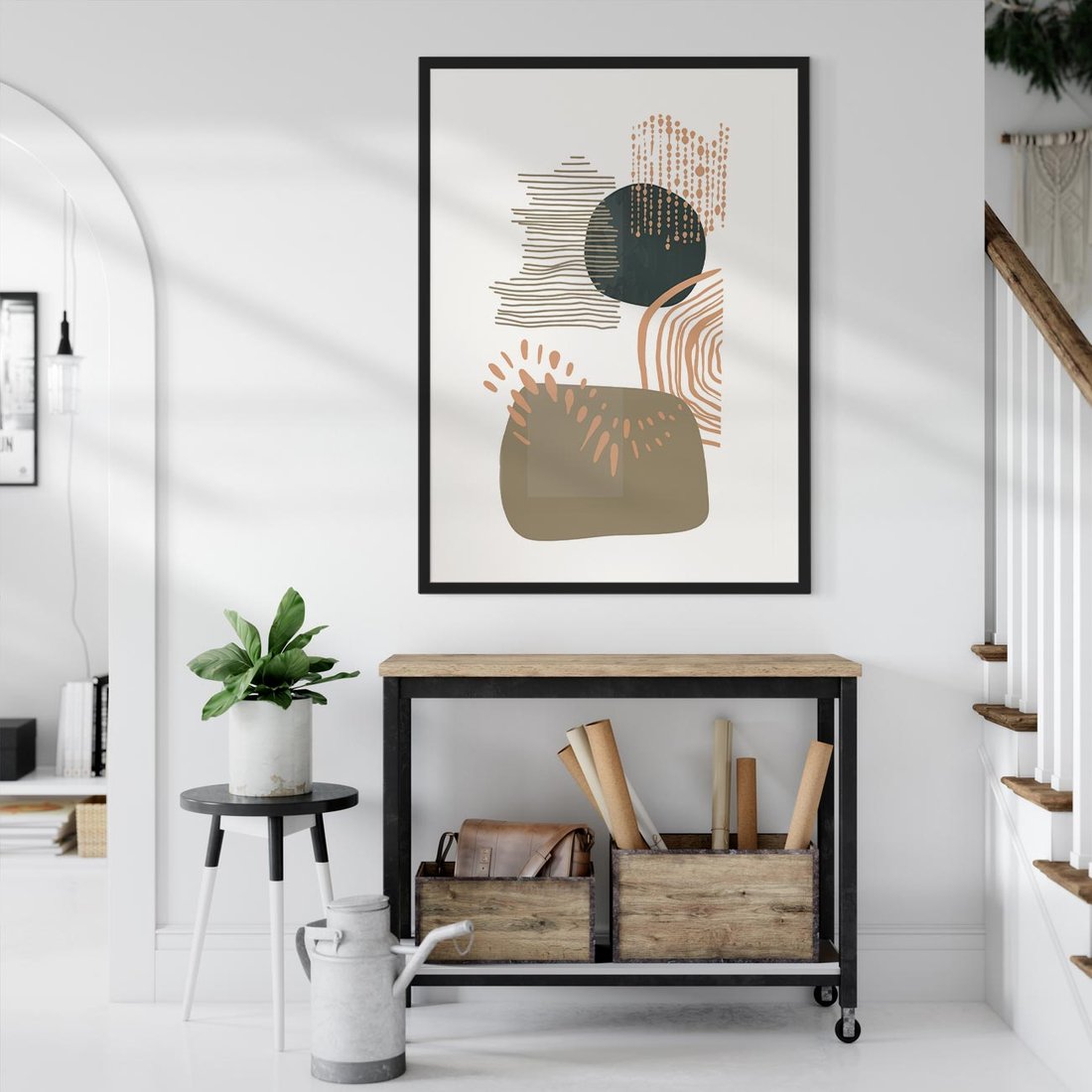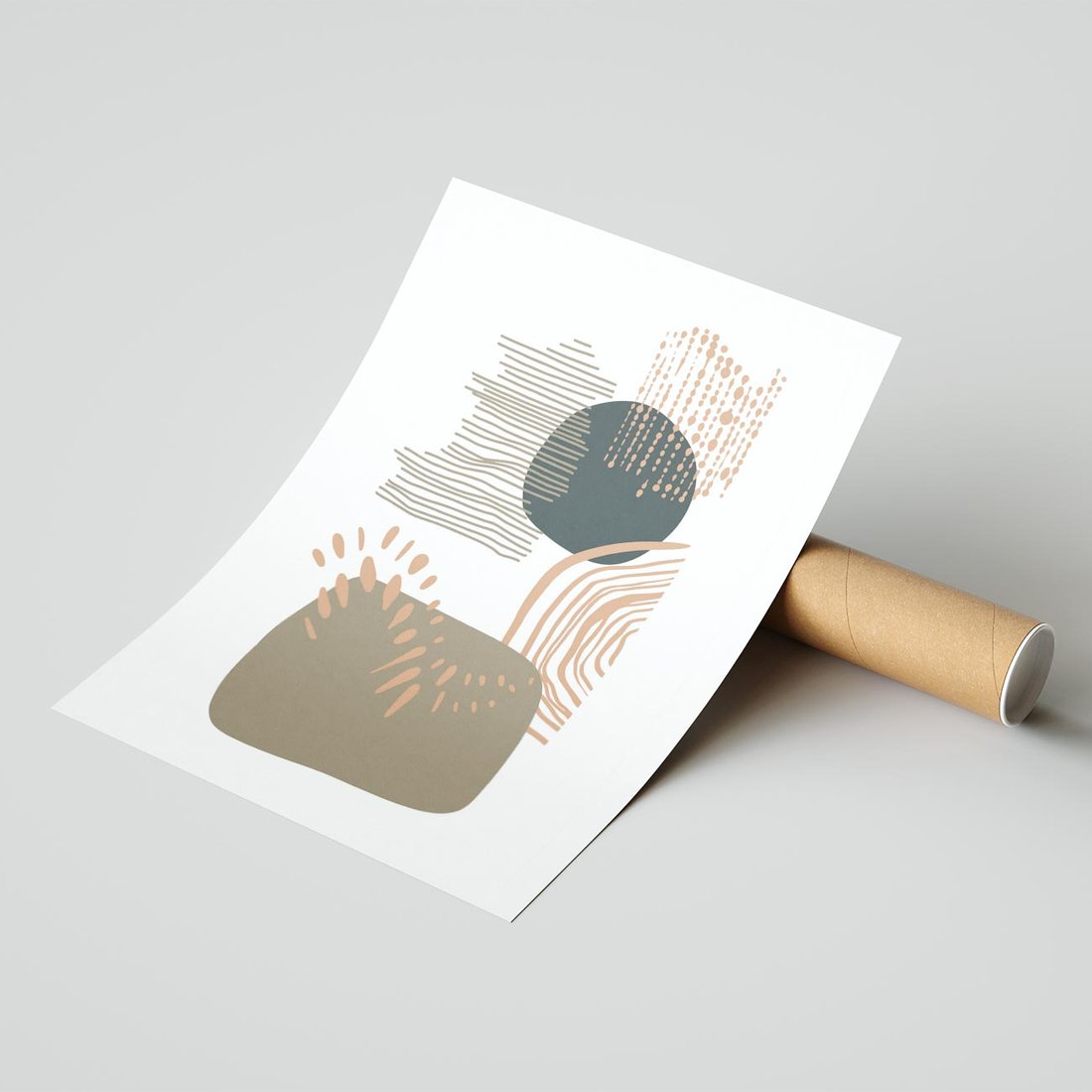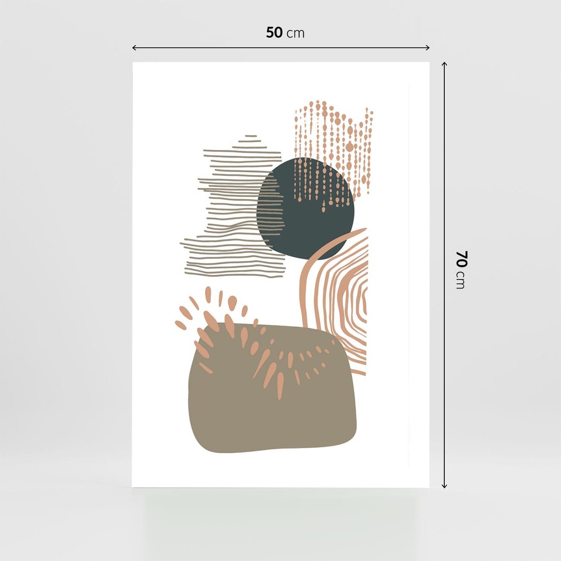 Ta abstrakcyjna kompozycja składa się z delikatnych kropek, kresek i kółek w spokojnych odcieniach brązu i beżu. Jej minimalistyczny charakter przynosi uczucie harmonii i spokoju, doskonale pasując do każdego wnętrza.