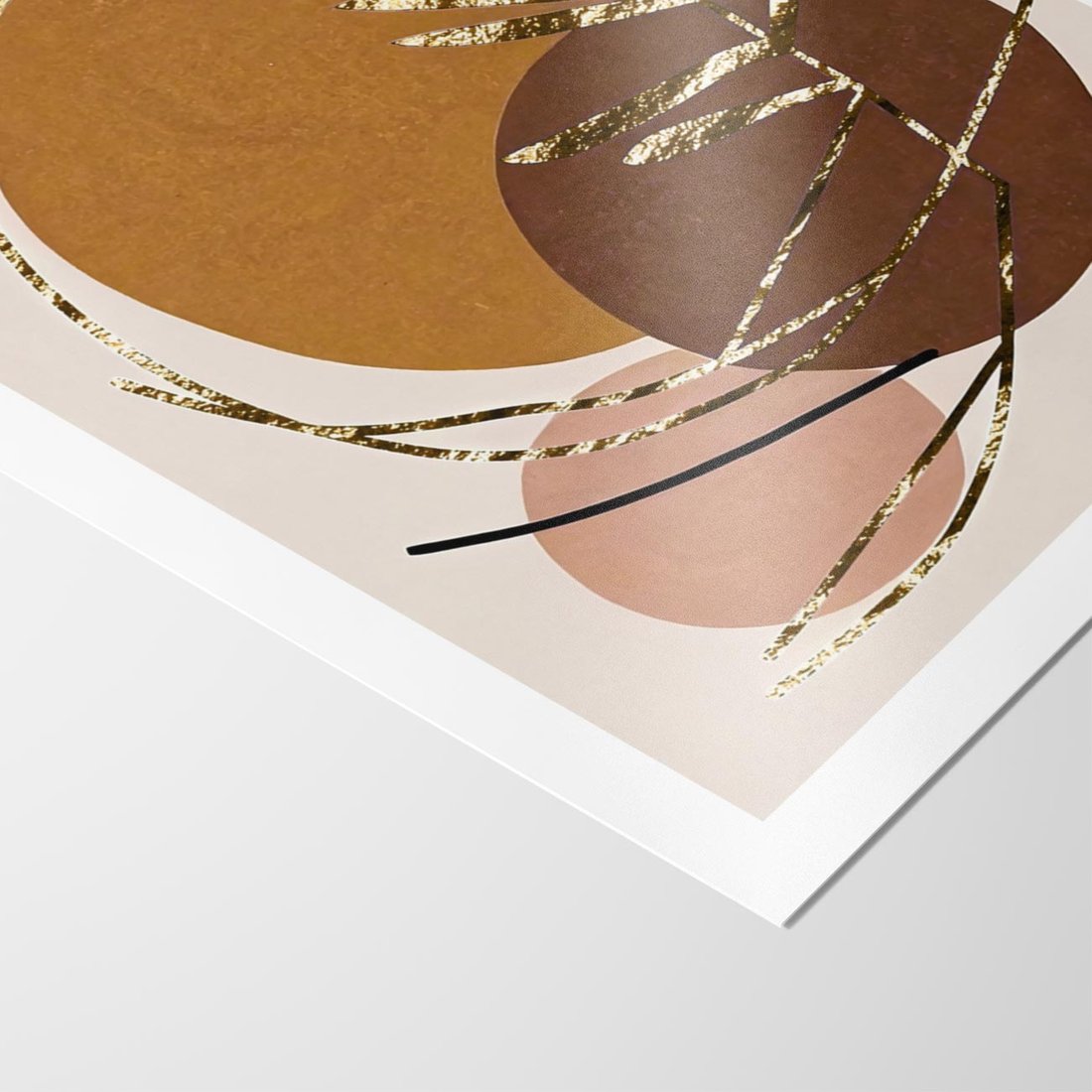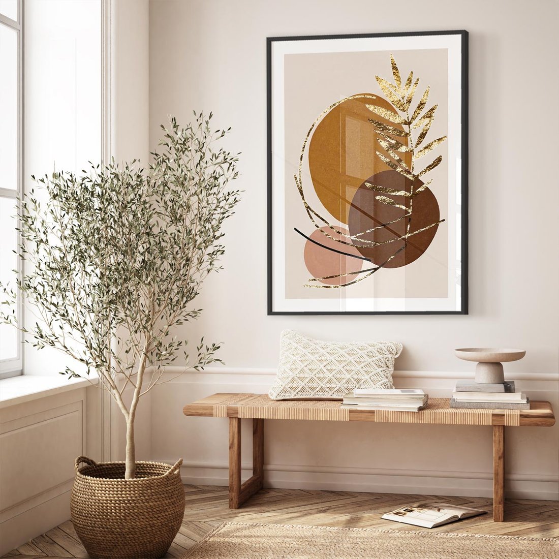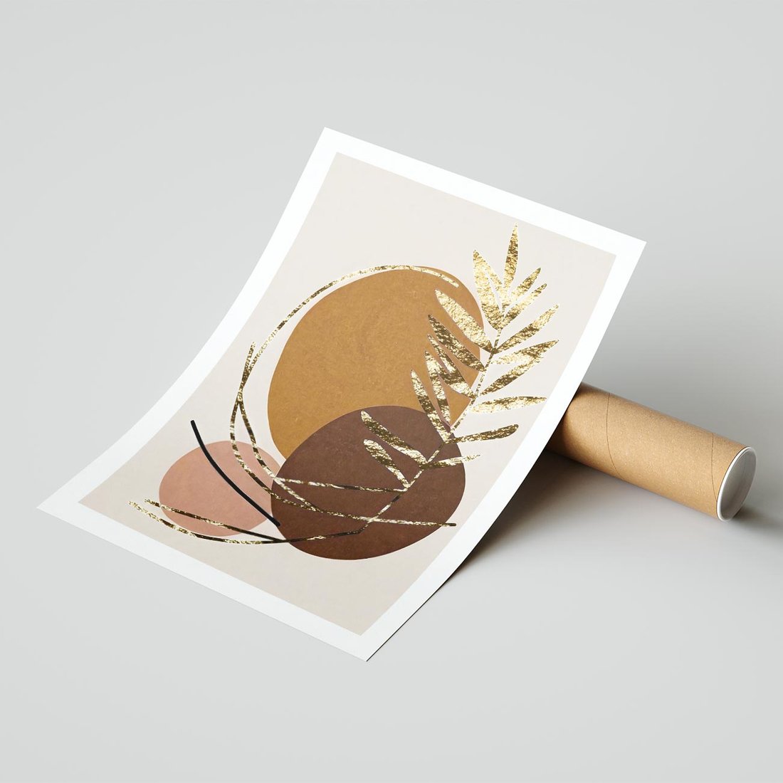 Ten abstrakcyjny obraz to prawdziwe dzieło sztuki, gdzie złote liście palmy kontrastują z geometrycznymi formami w odcieniach brązu. Kompozycja ta tworzy niepowtarzalny efekt, dodając elegancji i nowoczesności wnętrzu. To idealny sposób na dodanie wyjątkowego akcentu do Twojej przestrzeni.