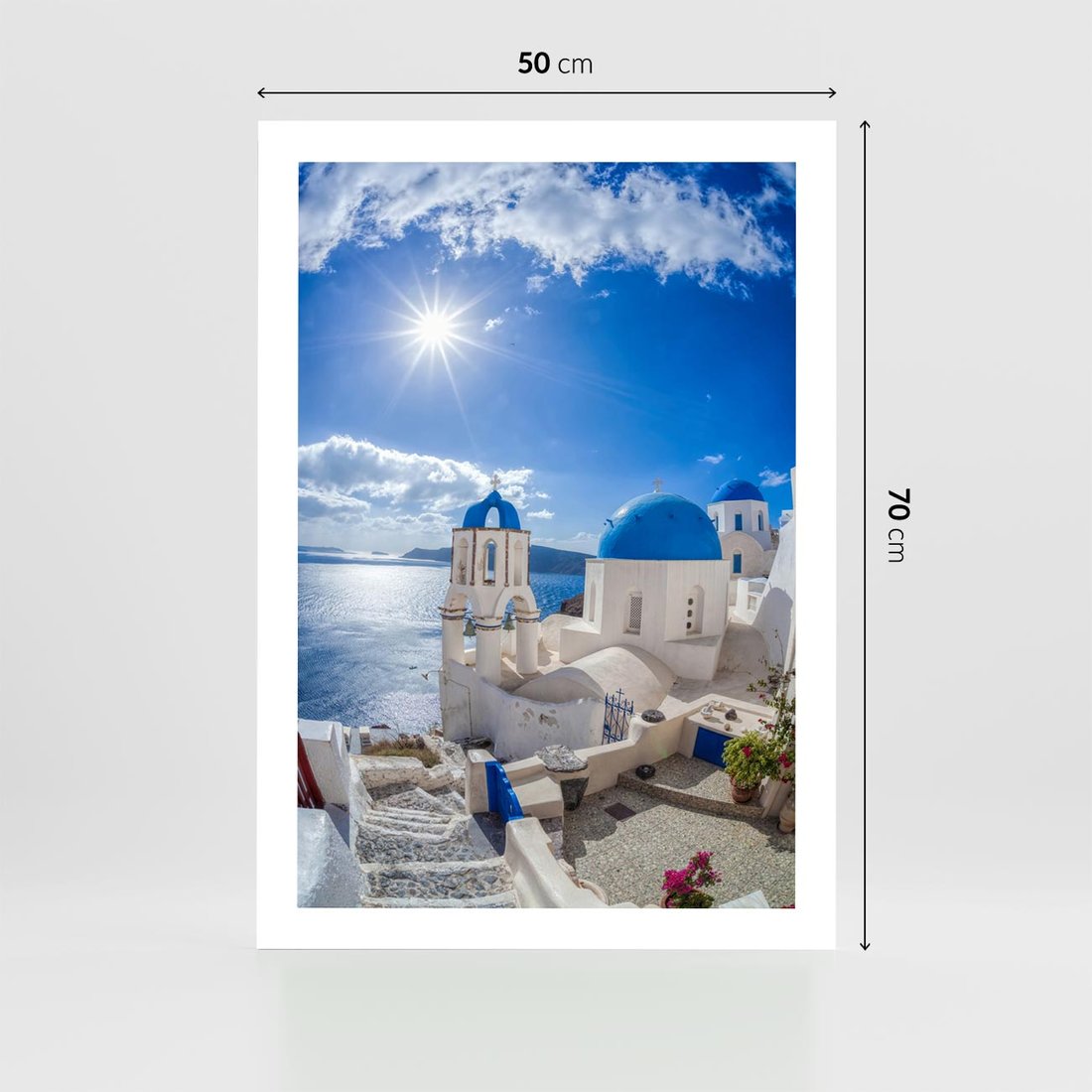 Ten obraz przenosi cię na malowniczą wyspę Santorini we Włoszech, gdzie białe domy i niebieskie kopuły kontrastują z niebem i morzem. Wyraźne kolory, romantyczne widoki i sielska atmosfera tworzą niezapomnianą aurę. Idealny dla miłośników podróży i tych, którzy pragną wprowadzić do swojego wnętrza nutę śródziemnomorskiego uroku i spokoju.